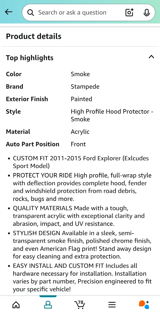 Selling a Stampede high profile hood protector in smoke color. It's made of tough, transparent acrylic that offers clarity and abrasion, impact, and UV resistance. It's designed to protect your ride with a full-wrap style that provides complete hood, fender, and windshield protection from road debris, rocks, bugs, and more. It also includes all hardware necessary for installation