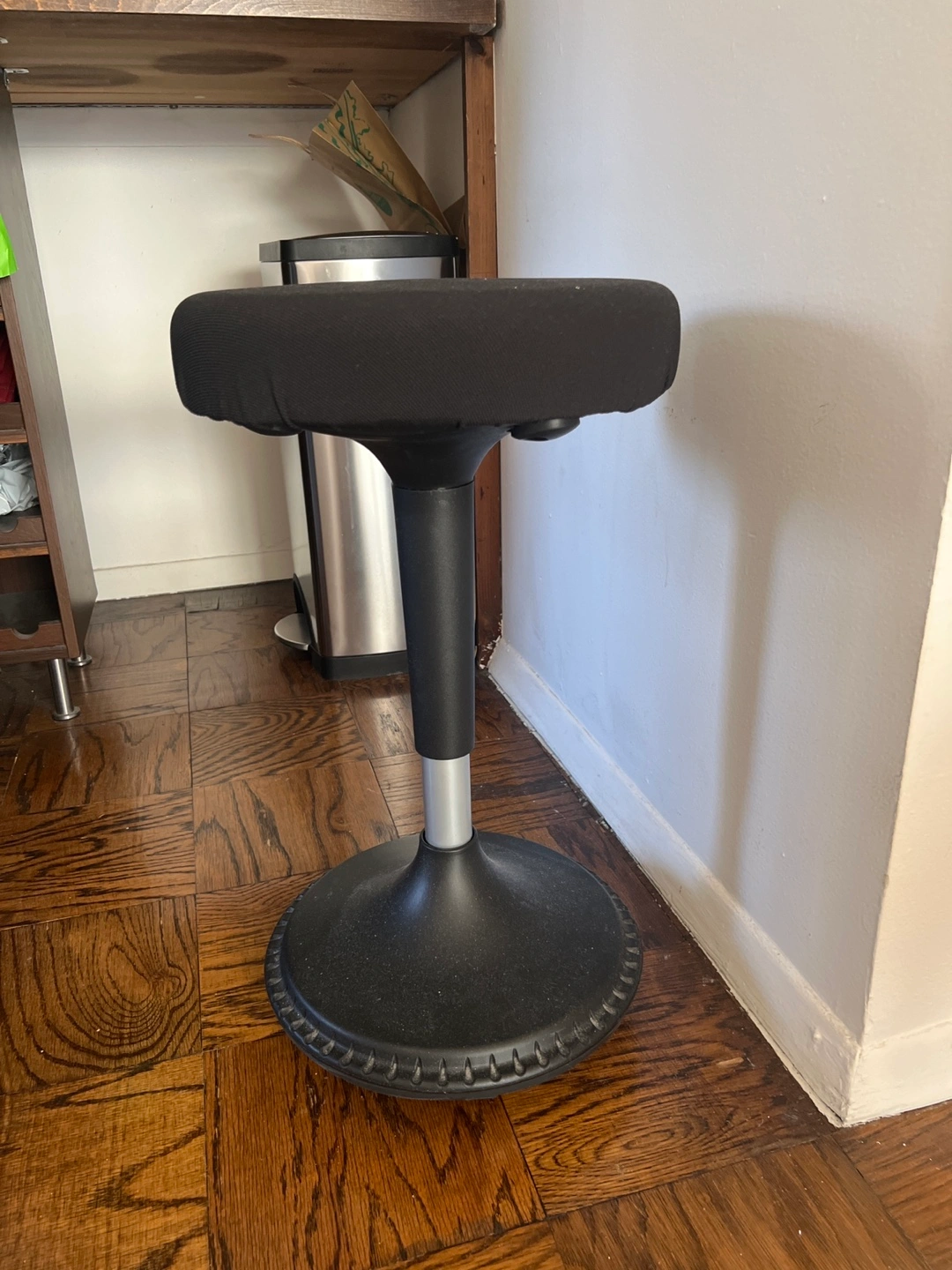 84Black fabric seat. Height adjustable. Small and compact. Sells for $100+ on Amazon https://a.co/d/fSbIeXR TRANSFORM YOUR WORKSPACE - Increase your energy and productivity with the Backerz desk stool. This stool is not just a piece of furniture, but a catalyst for an energetic workday. Revolutionize your workplace and tackle your tasks with unparalleled verve. HEIGHT ADJUSTABLE DESIGN - Whether you work at a regular office desk or a standing desk, our ergonomic stool chair is the perfect addition. With the two buttons under the seat, you can adjust the height of the stool from 21-31 inch or from 16-24 inch, depending on which size you choose