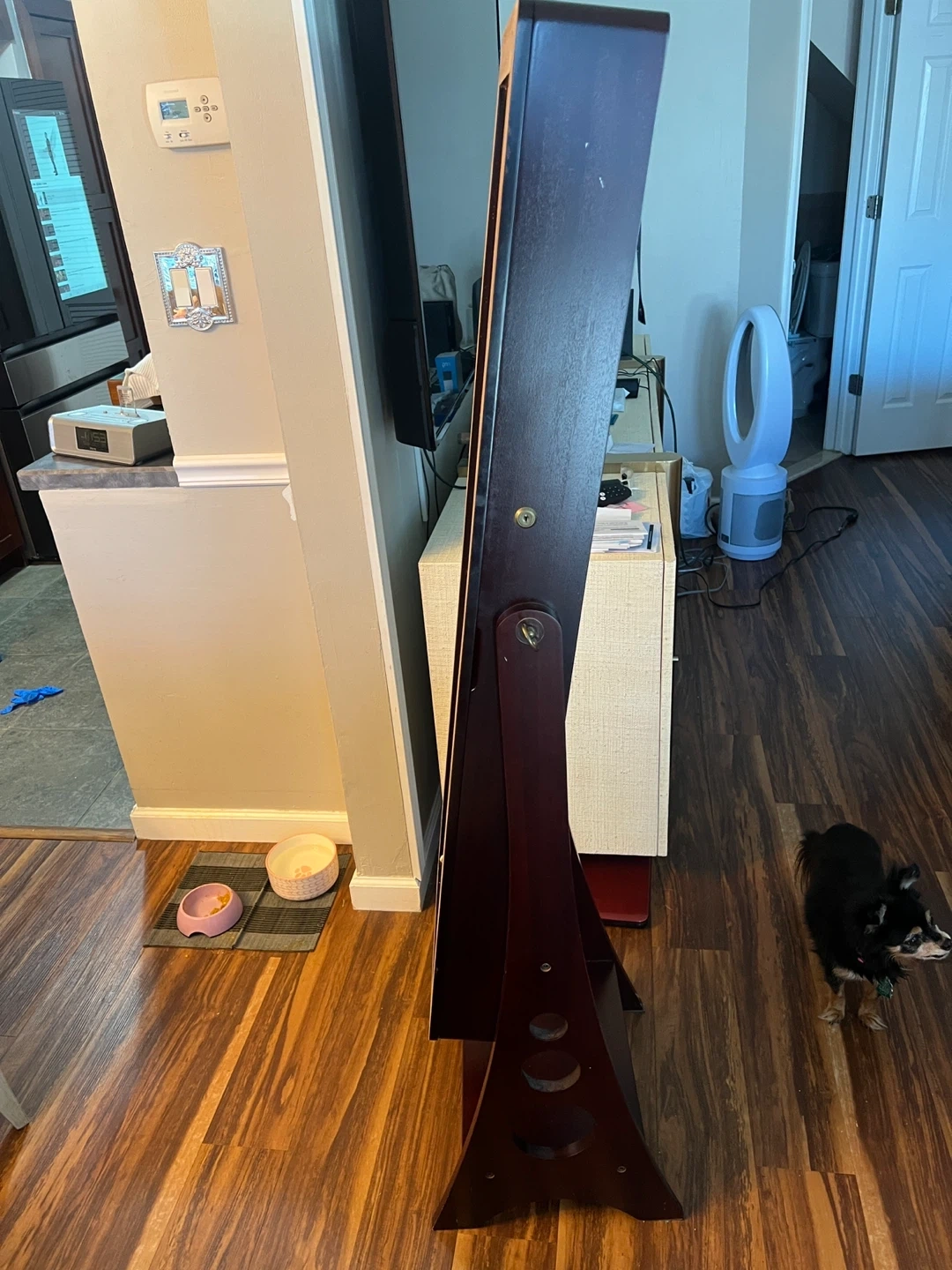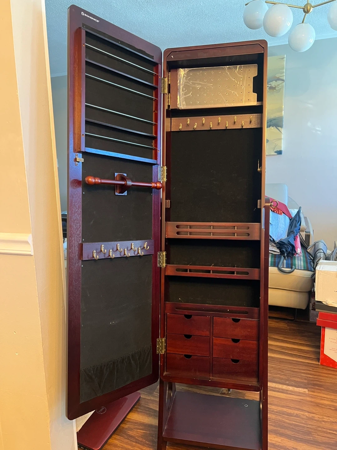 64This is a standing jewelry armoire with a mirrored cabinet. It has a dark wood finish and features drawers, hooks, and shelves for organizing jewelry and accessories. It's a great way to keep your jewelry collection organized and easily accessible. Ready to o install a new mirror