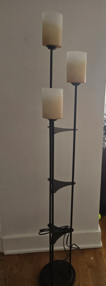60Here is a standing tripple floor lamp with adjustable brightness! It features a dark brown metal frame with three candle holders and small shelves. It would be a great addition to any room!