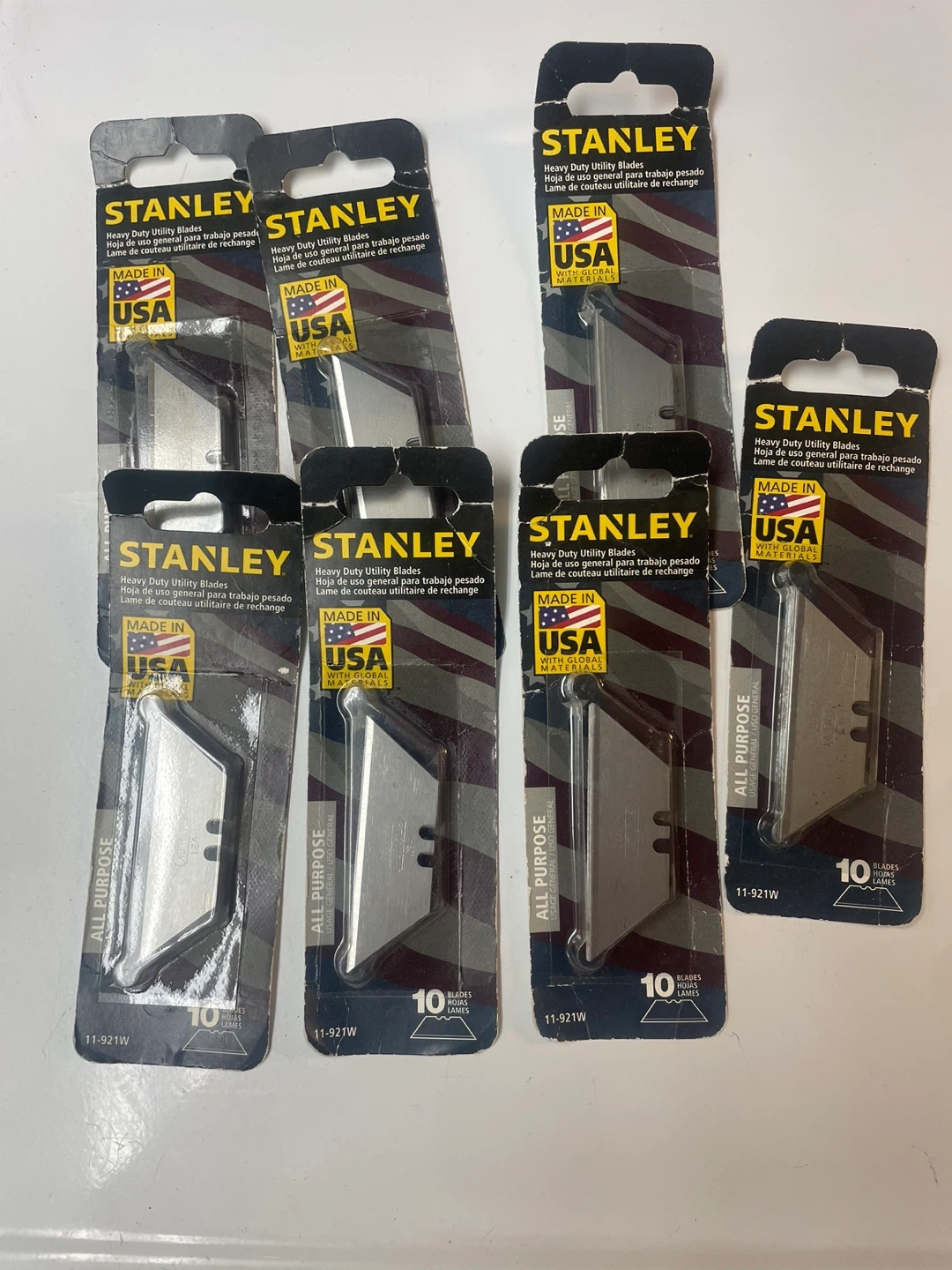 66Selling 7 packs of Stanley Heavy Duty Utility Blades. Each pack contains 10 blades. Model number is 11-921W. These blades are made in the USA with global materials and are suitable for all-purpose use Total 70 blades