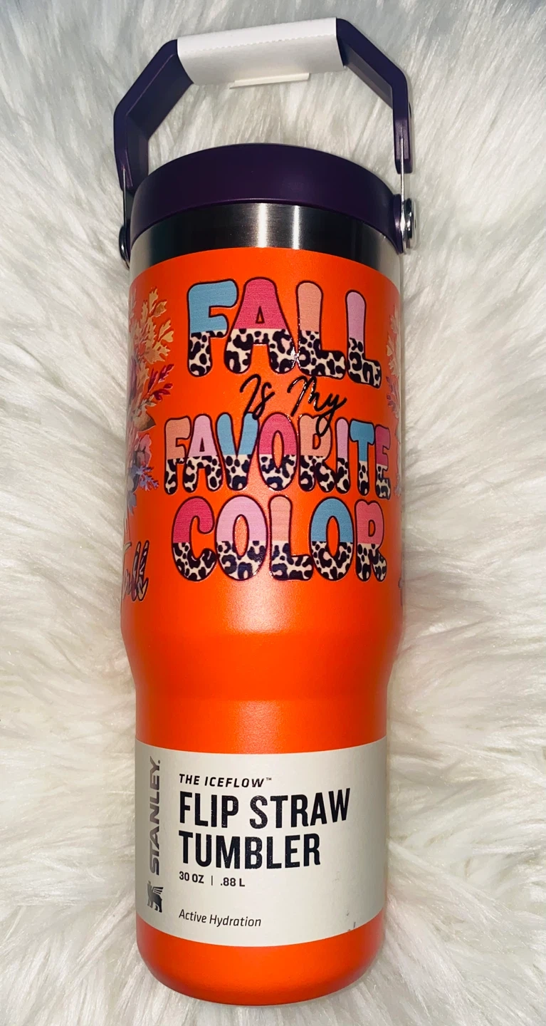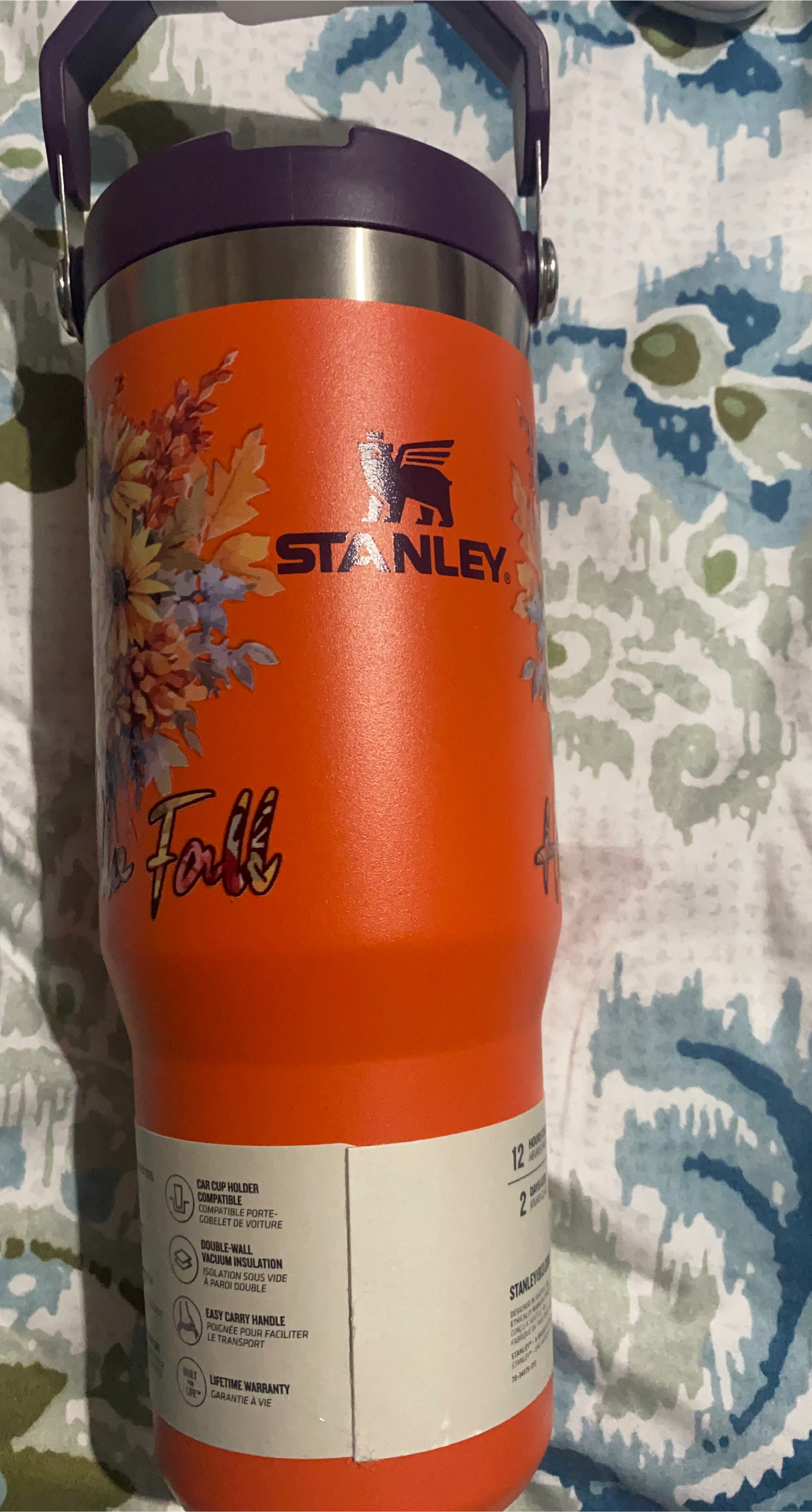60I'm selling a new fall-themed Stanley The IceFlow Flip Straw Tumbler! It holds 30 oz and is perfect for staying hydrated. It features a double-wall insulation to keep your drinks cold, an easy carry handle, and fits in car cup holders.