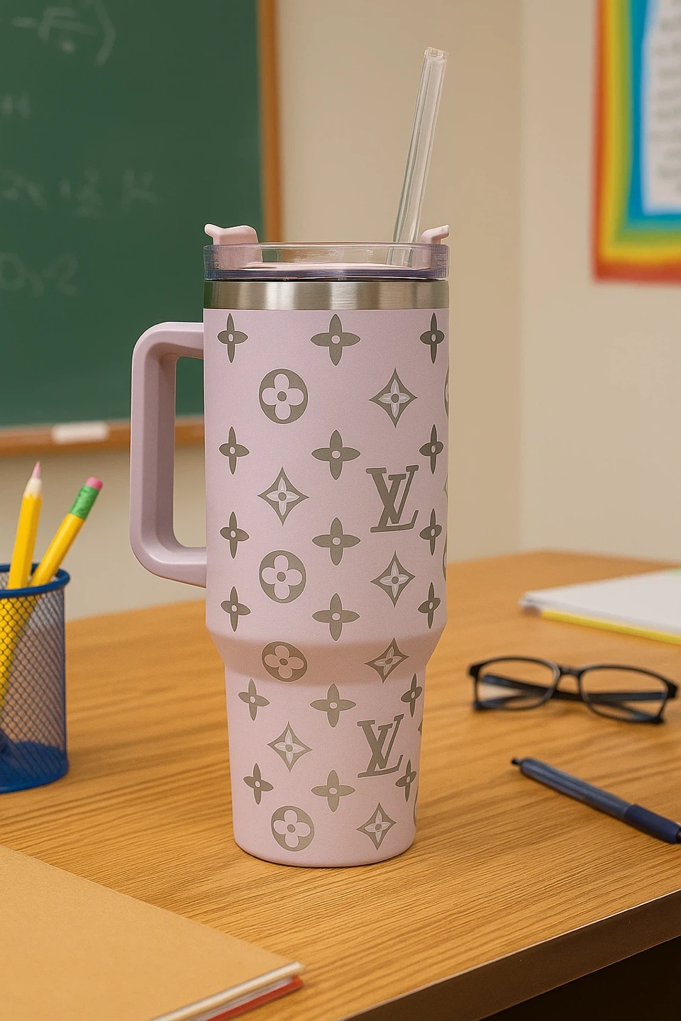 Check out this fun Stanley tumbler with a Louis Vuitton-inspired design! It's perfect for keeping your drinks cold or hot on the go. It comes with a straw and a handle for easy carrying