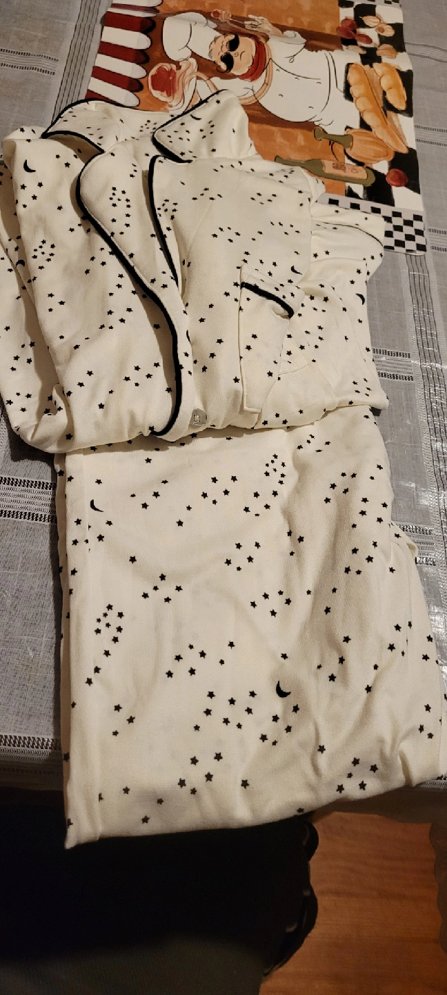 10Here's a comfy pajama set with a star and moon print! The fabric is soft and cozy, perfect for a good night's sleep. The set includes a long-sleeved top and pants, both in a light color with contrasting dark trim. size xs
