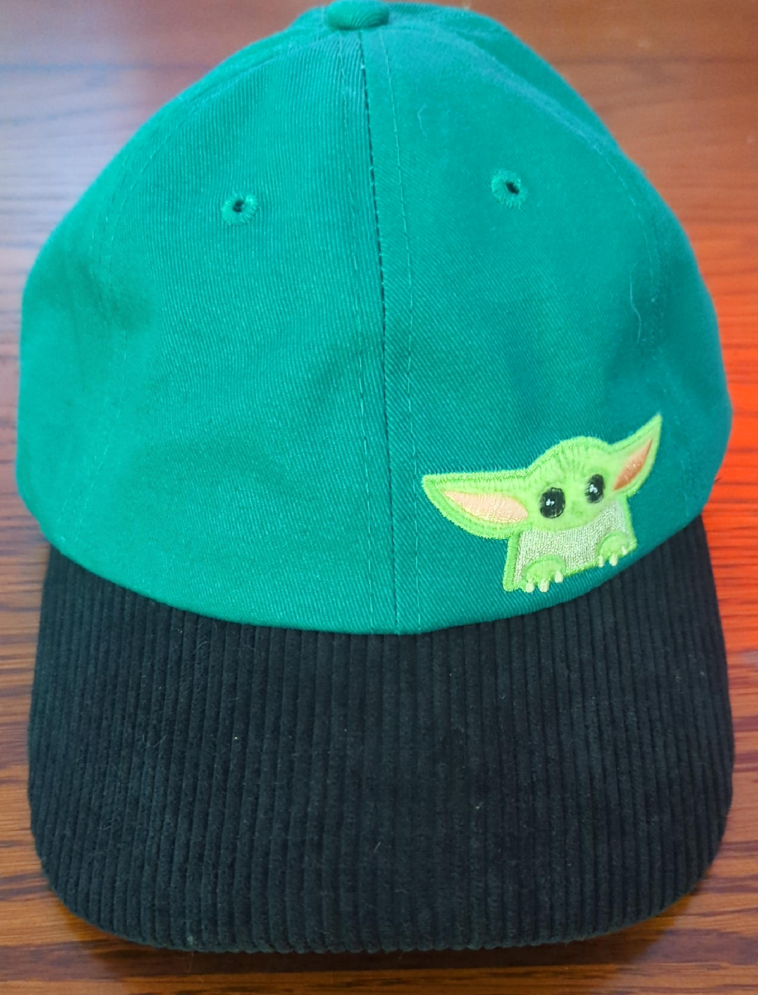 This is a green hat with a black, corduroy brim portraying The Child/Grogu from the Mandalorian on the front. It can be described as an unstructured hat but most people call them dad caps.