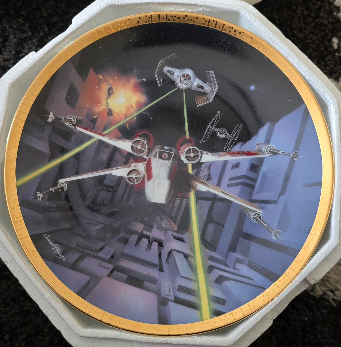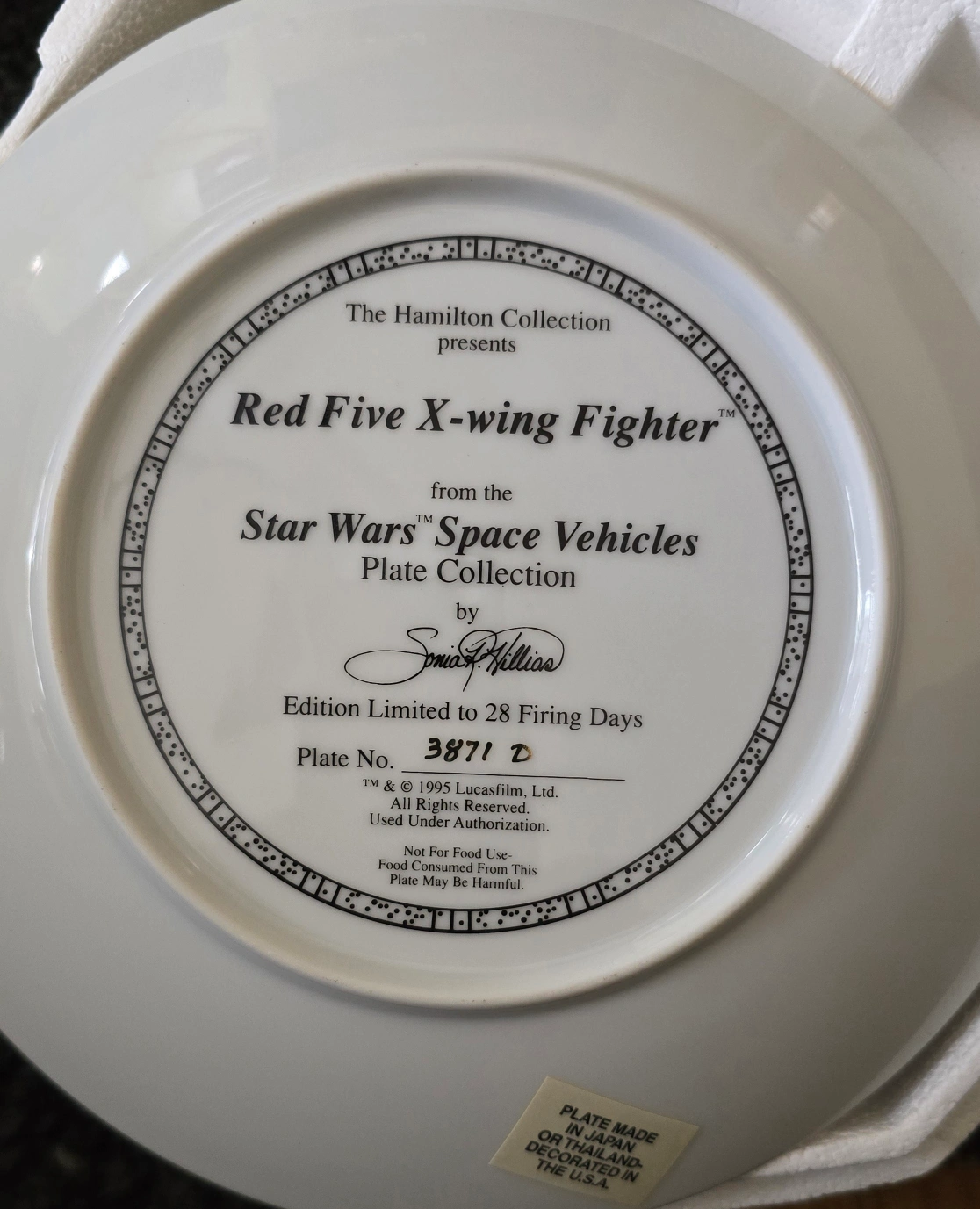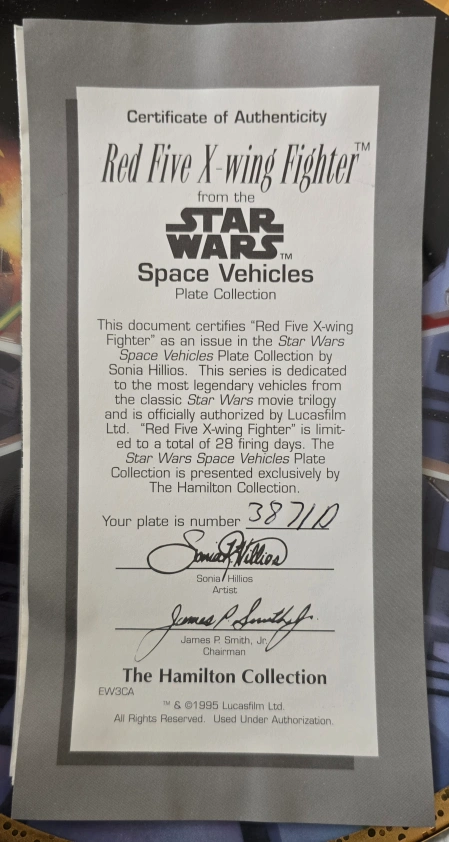 Limited edition collector plate. Part of the Star Wars Space Vehicles Plate Collection by Sonia Hillos. Features Red Five X-wing Fighter. Numbered 3871D. From the Hamilton Collection.