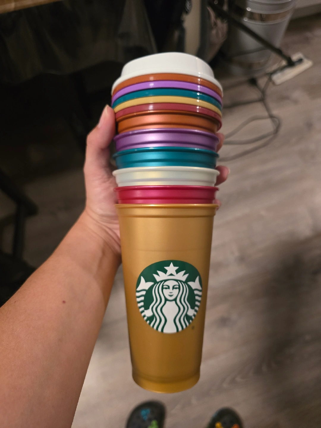 Selling 6 Starbucks Iridescent hot cups with a set of colorful lids! The cups are in great condition and ready for your favorite hot drinks. Perfect for adding a bit of sparkle to your day. There are 6 cups with 6 matching color lids.