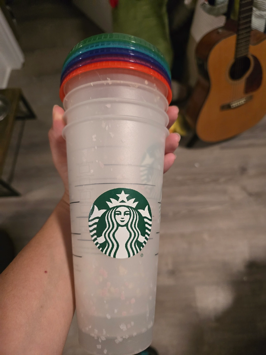 Selling a Starbucks reusable cold cups! It comes with a set of colorful lids. Perfect for your iced coffee or other cold drinks. It's in great condition and ready for a new home. have four cups & five lids.