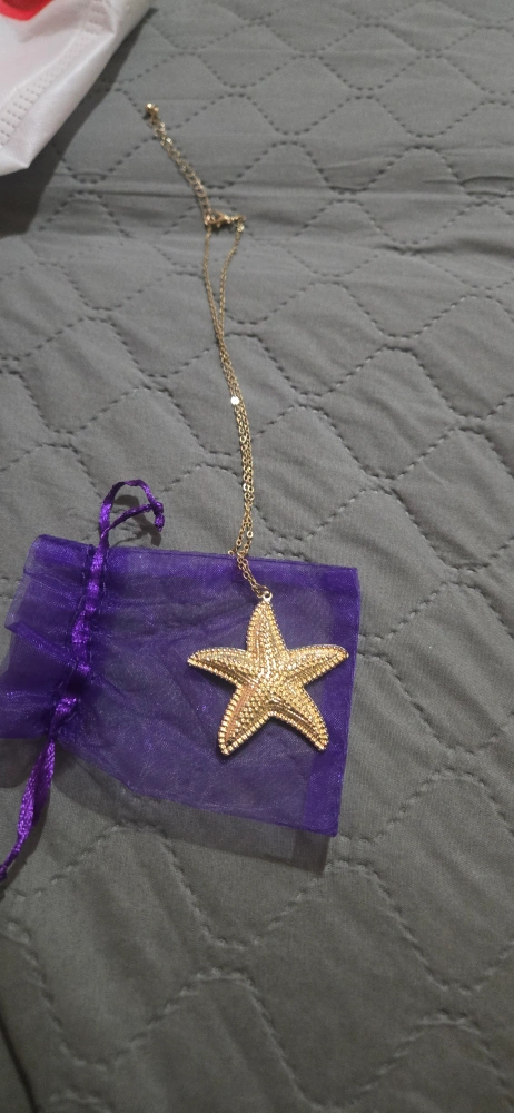 Selling a cute starfish pendant necklace! It has a gold-tone chain and the starfish pendant is embellished with small rhinestones. It comes in a purple drawstring pouch