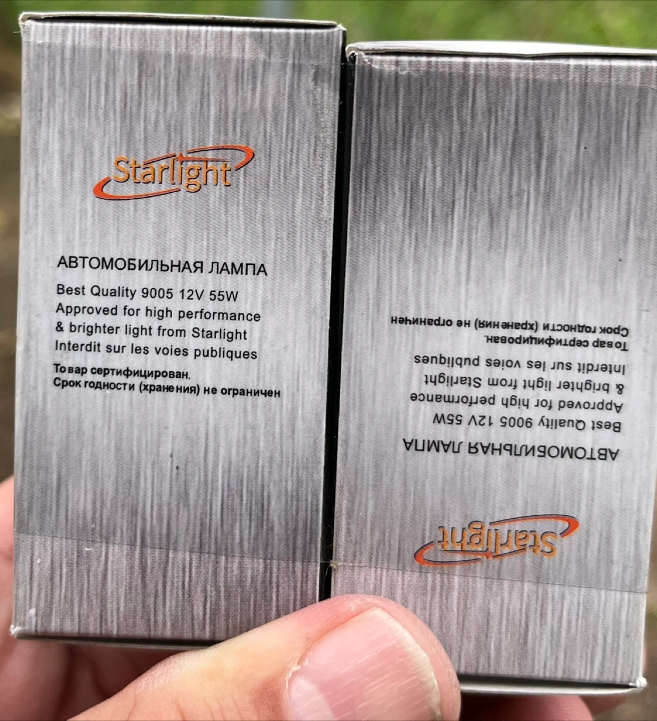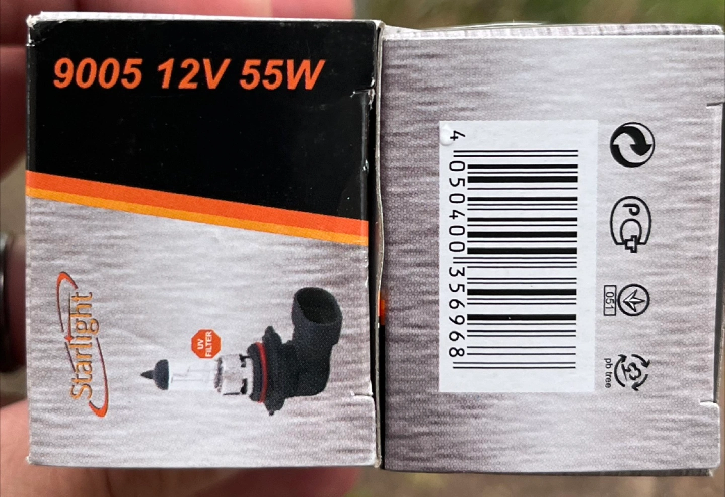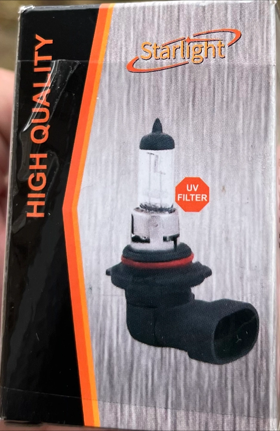 Selling a new Starlight 9005/9006 12V 55W headlight bulb. The box says it's high quality and approved for high performance, giving a brighter light from Starlight. It also has a UV filter.