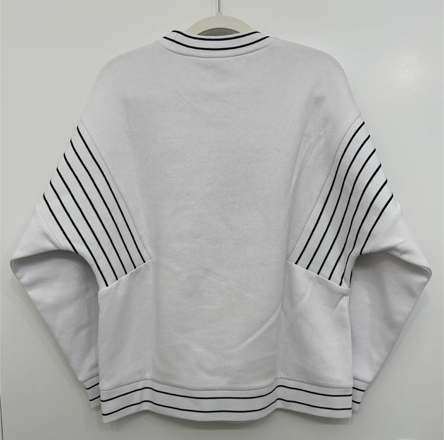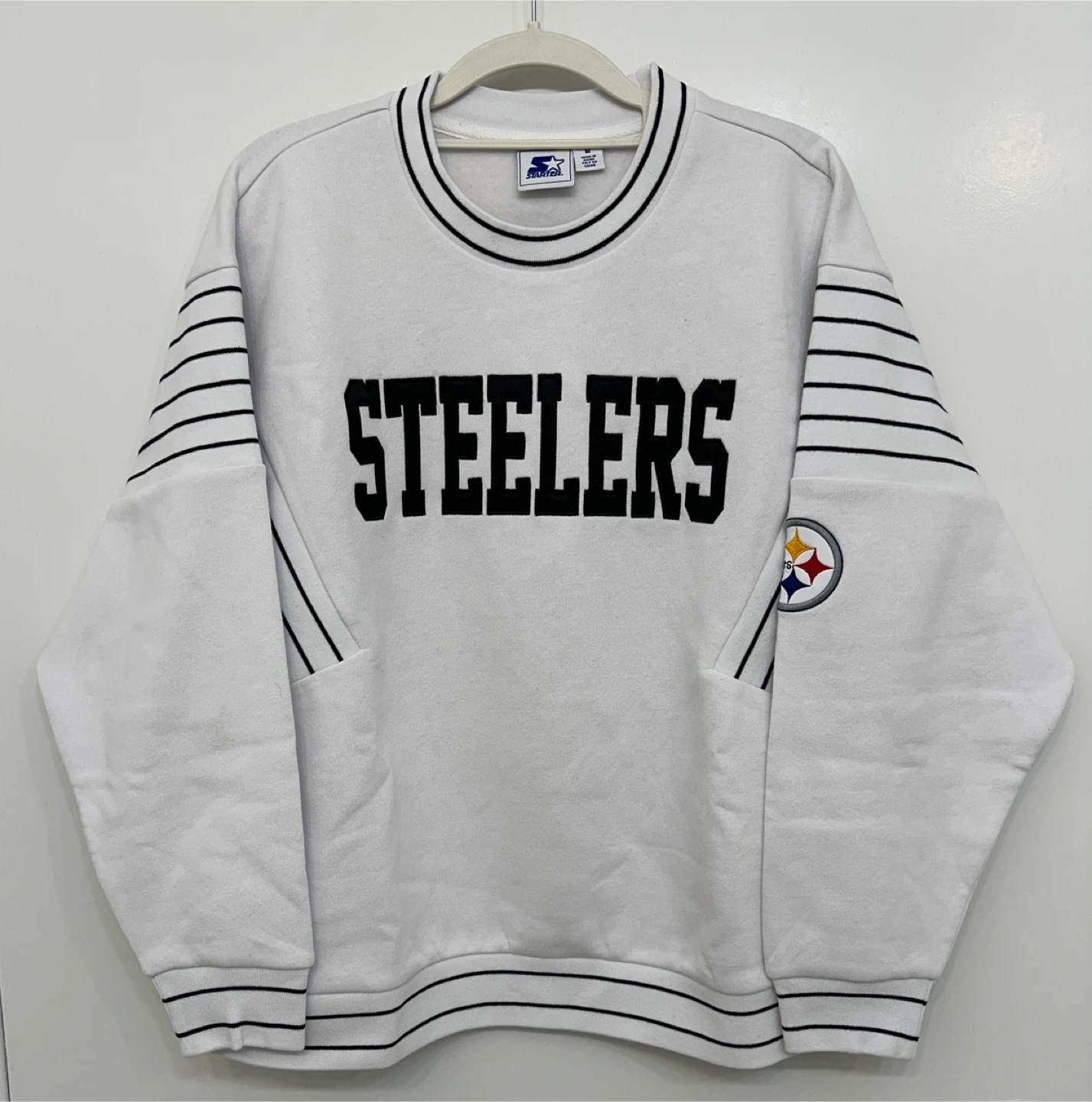 1000+Selling a Steelers crewneck sweatshirt in size medium! It's white with black stripes and the Steelers logo on the sleeve. Great for any Steelers fan!