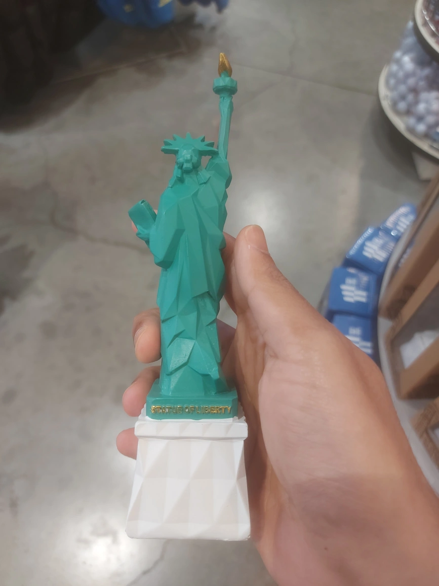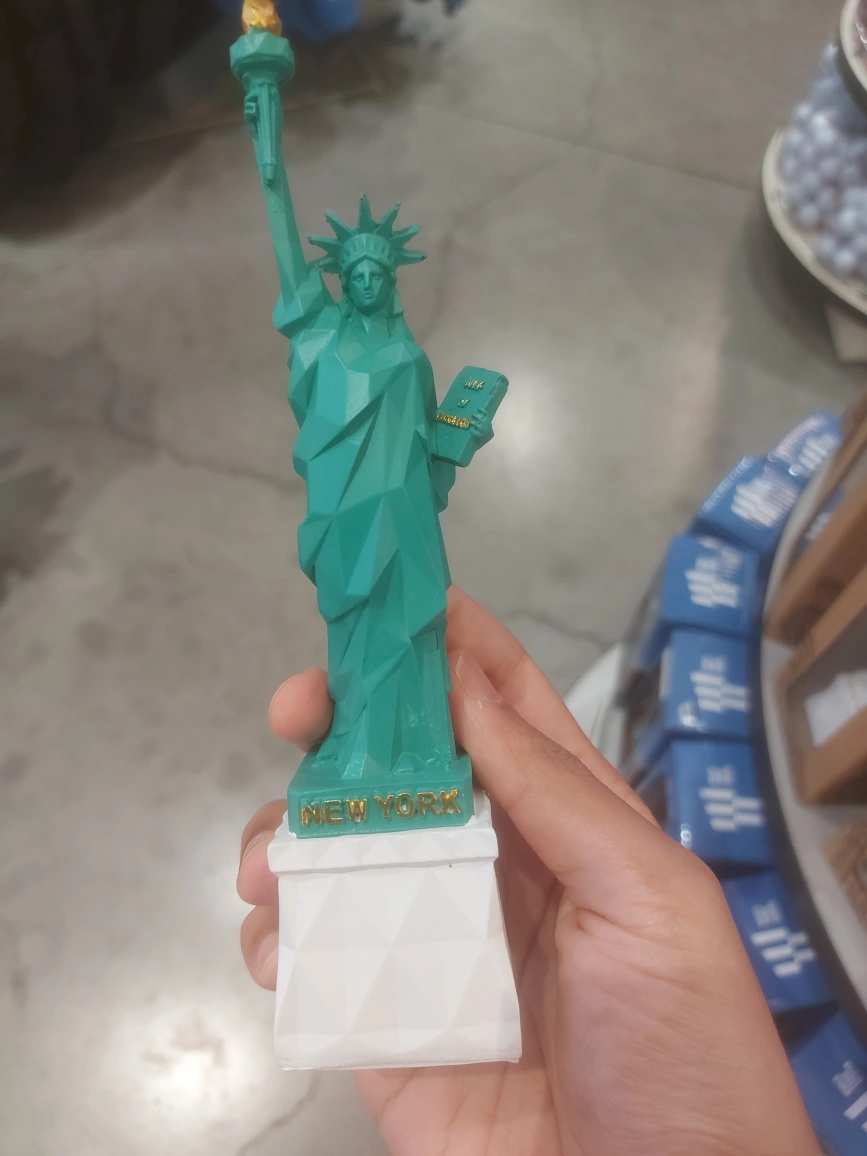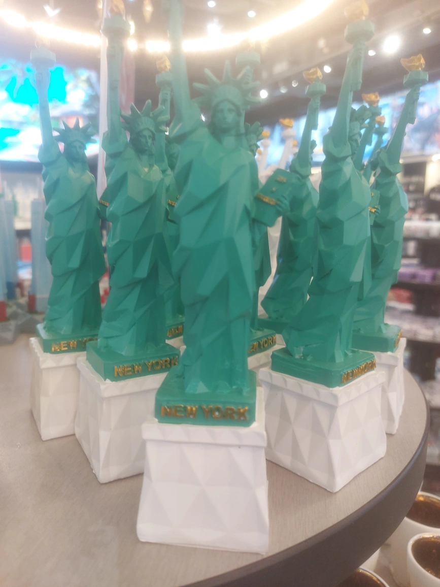 A Statue of Liberty souvenir, in teal and gold. It has a white base with a geometric design. The word "New York" appears on the base. You could place it on your desk and be reminded of the city.