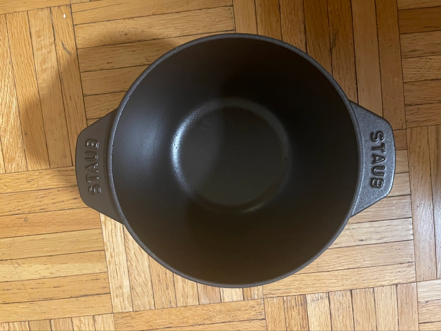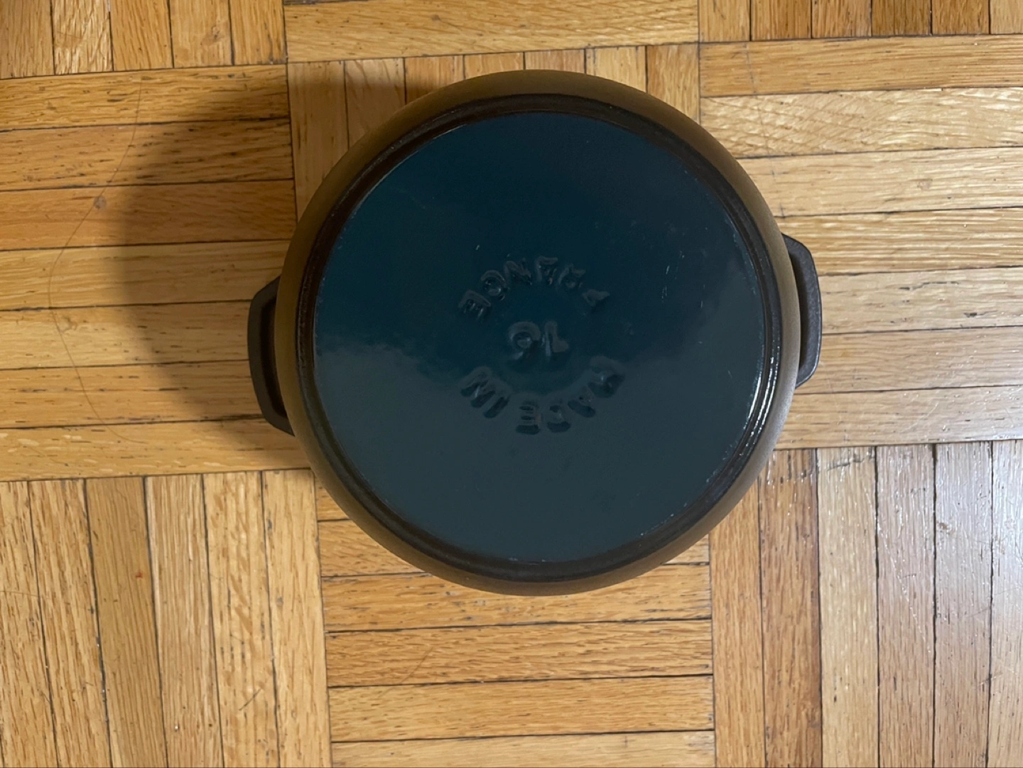 471.5-quart matte black cast iron French oven. Made in France. Gold knob.