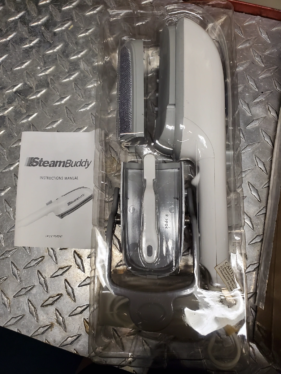 Selling a brand new SteamBuddy handheld steamer, still in its original packaging! This portable steamer is perfect for quick touch-ups and removing wrinkles from clothes. Includes the instruction manual