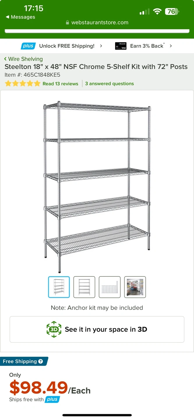 5Chrome shelving unit. Five shelves. 72" posts. Anchor kit may be included.