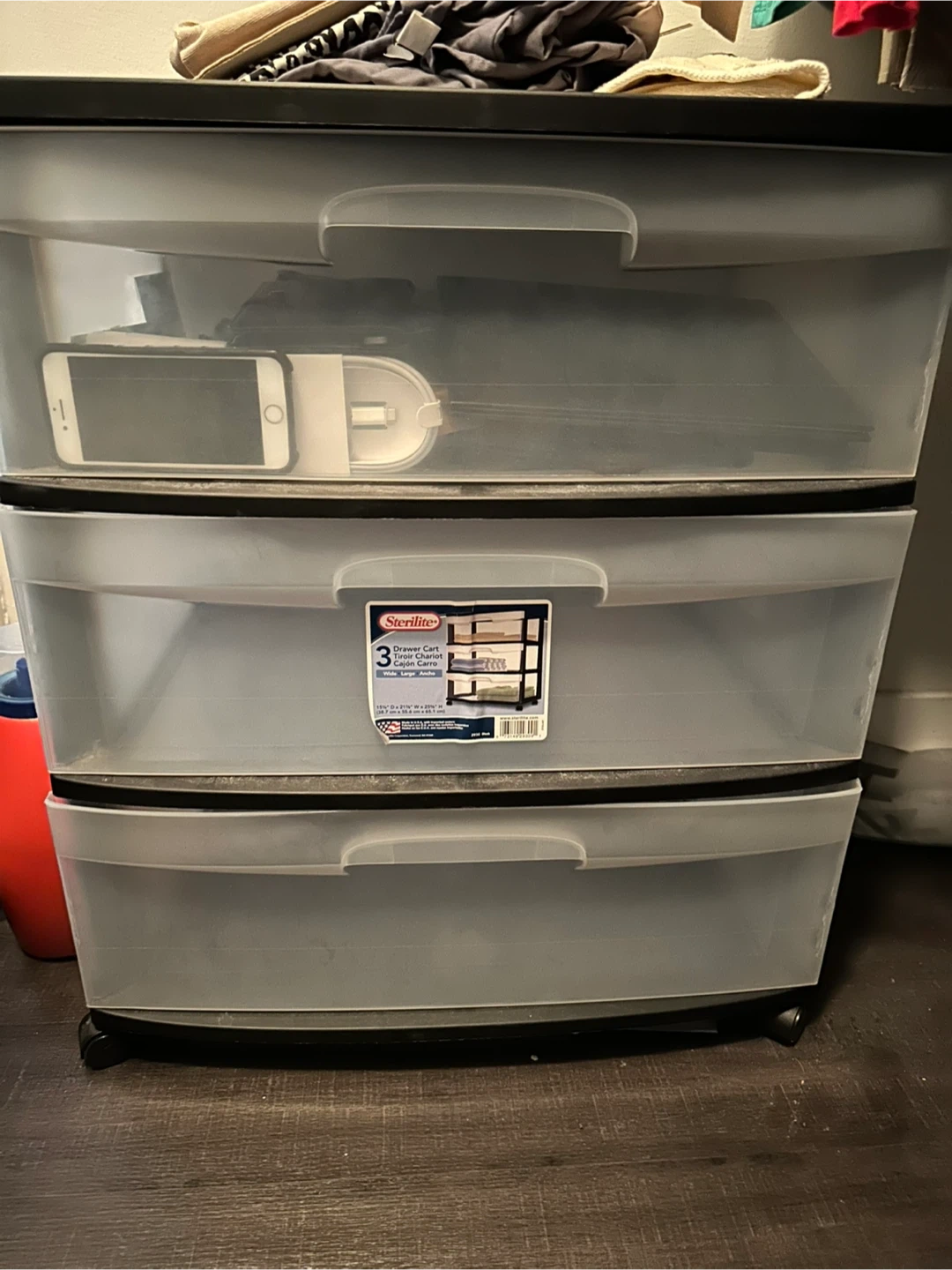 Selling a Sterilite 3-drawer cart! It's perfect for organizing your space. This cart has three drawers and is on wheels, making it easy to move around