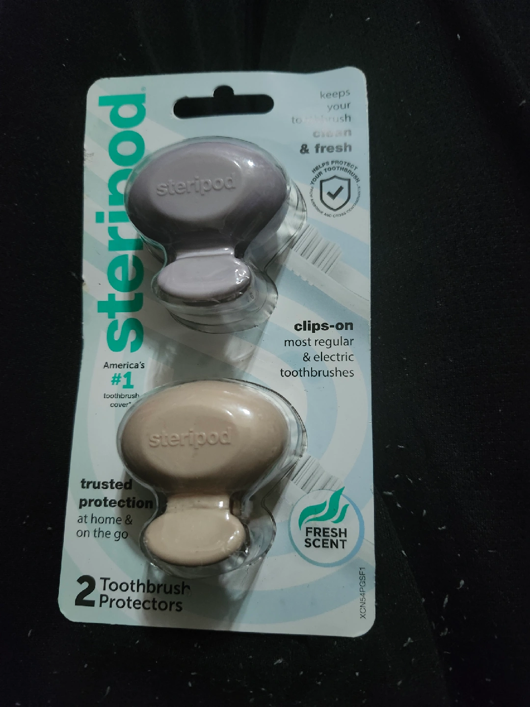 I'm selling a new pack of Steripod toothbrush protectors! This pack includes two protectors to keep your toothbrush clean and fresh at home or on the go. They clip on to most regular and electric toothbrushes and have a fresh scent