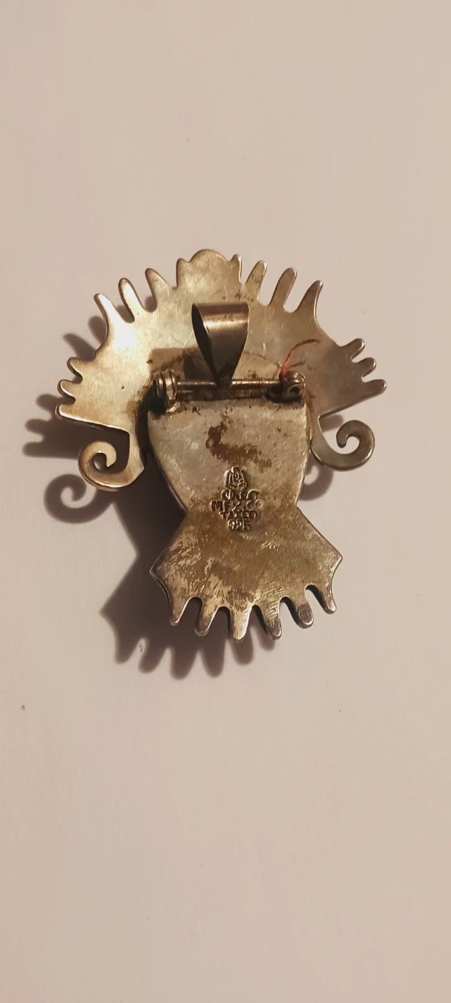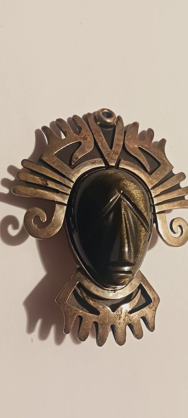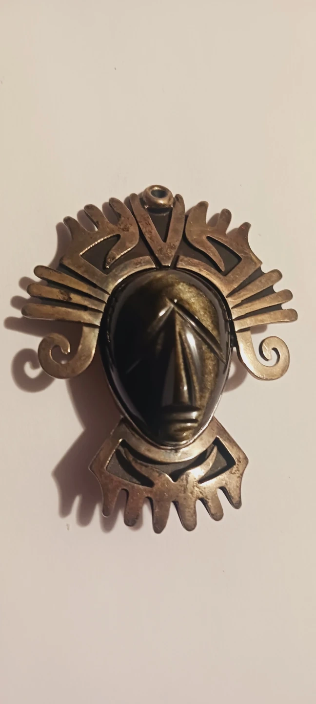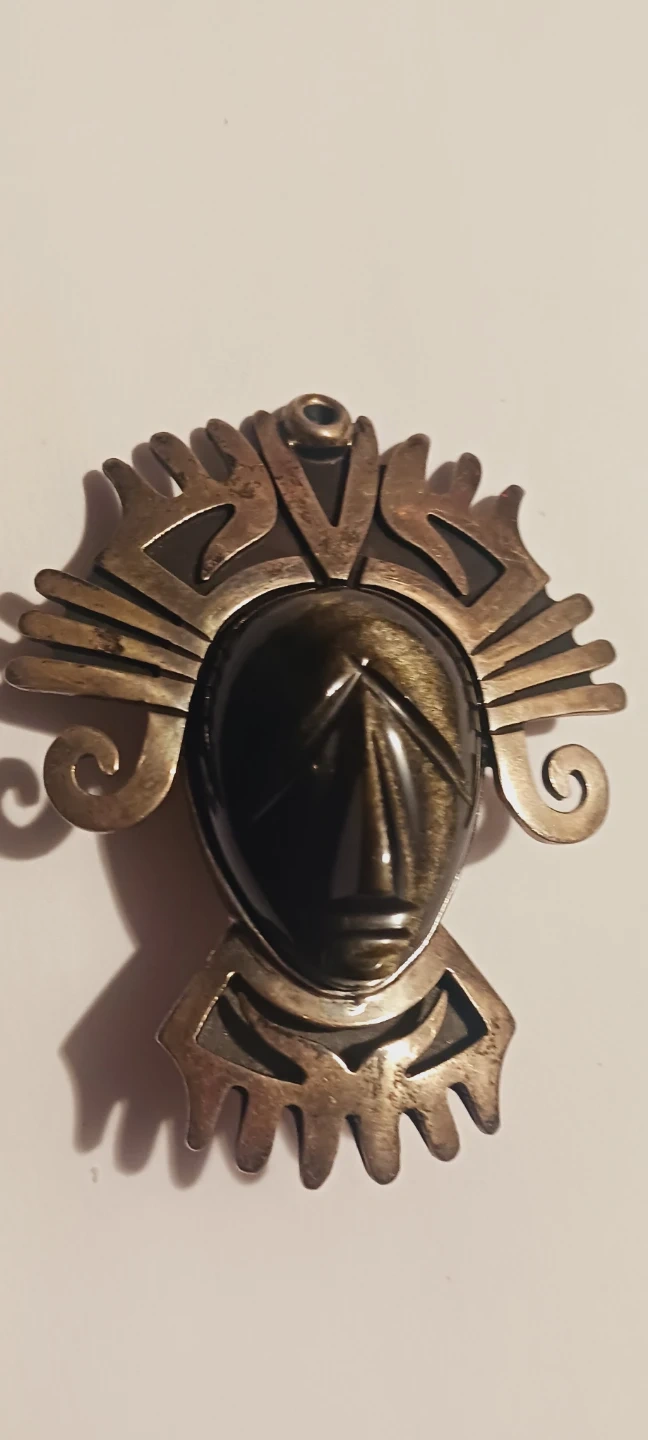 Sterling Silver Aztec Mayan Mask Obsidian Stone Pendant/Brooch