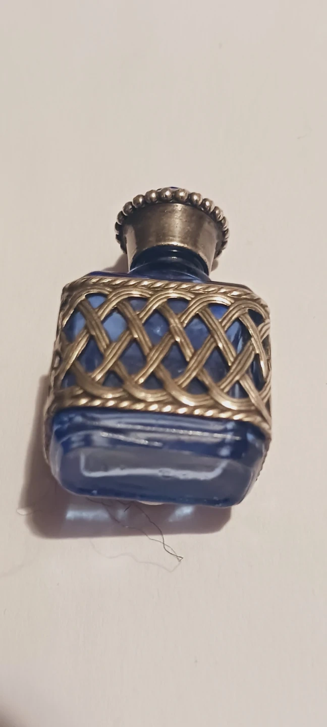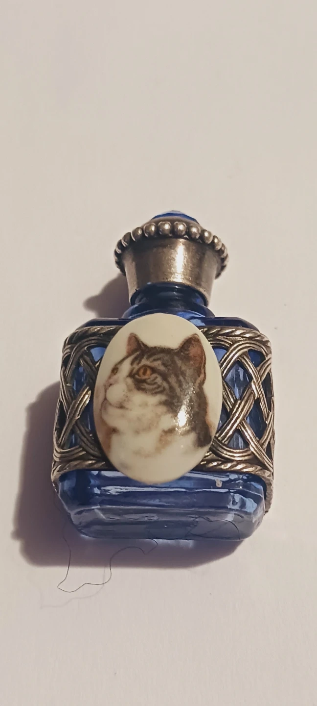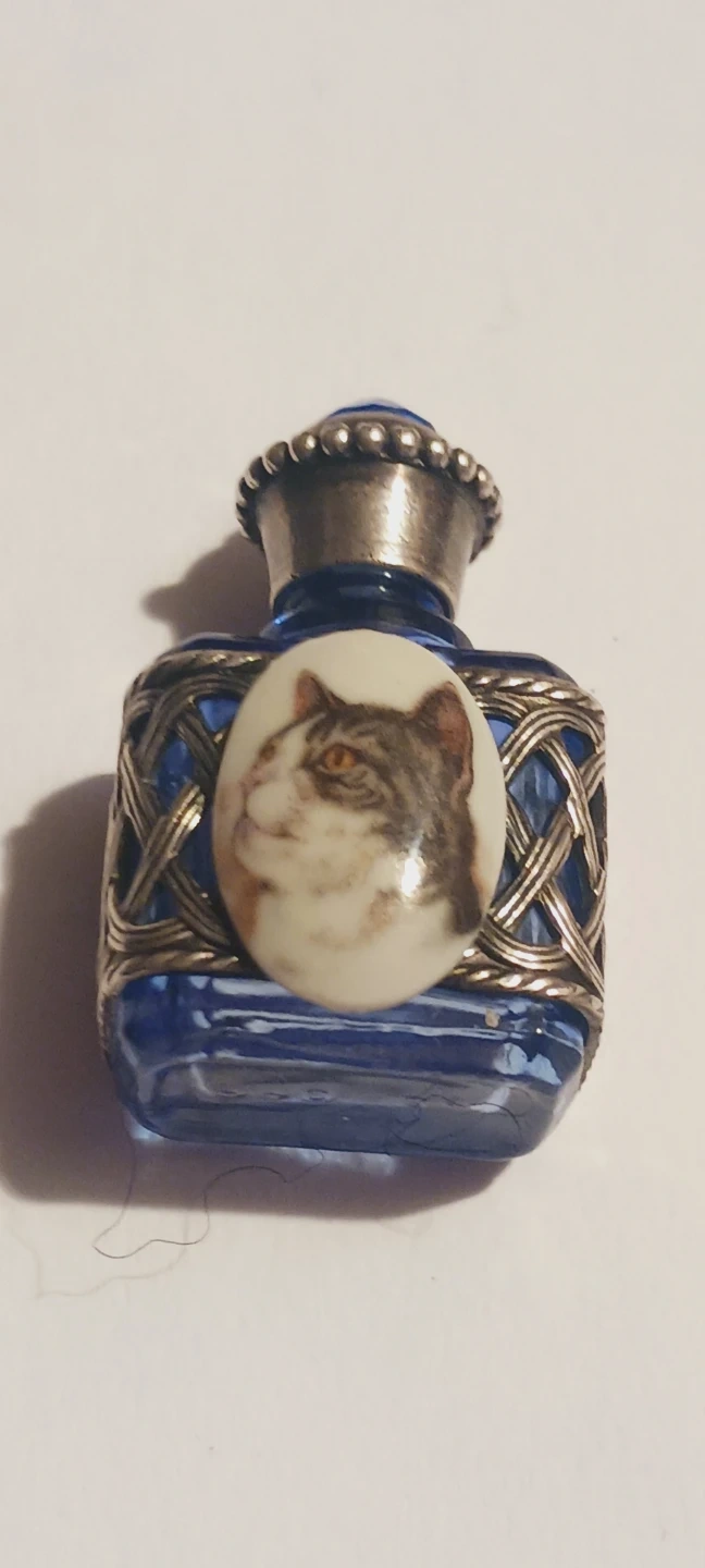 1000+This is a beautiful little blue glass perfume bottle. It has a silver colored metal filigree design and a cat portrait on the front. It's in great condition!