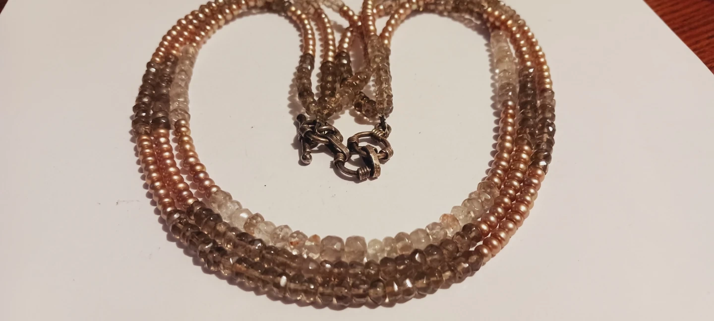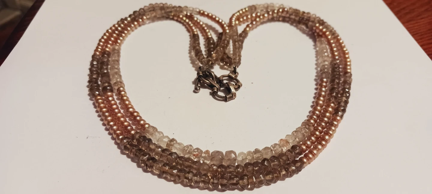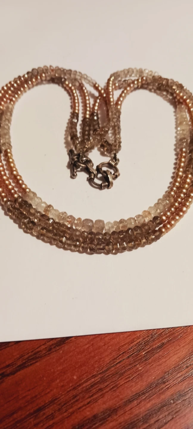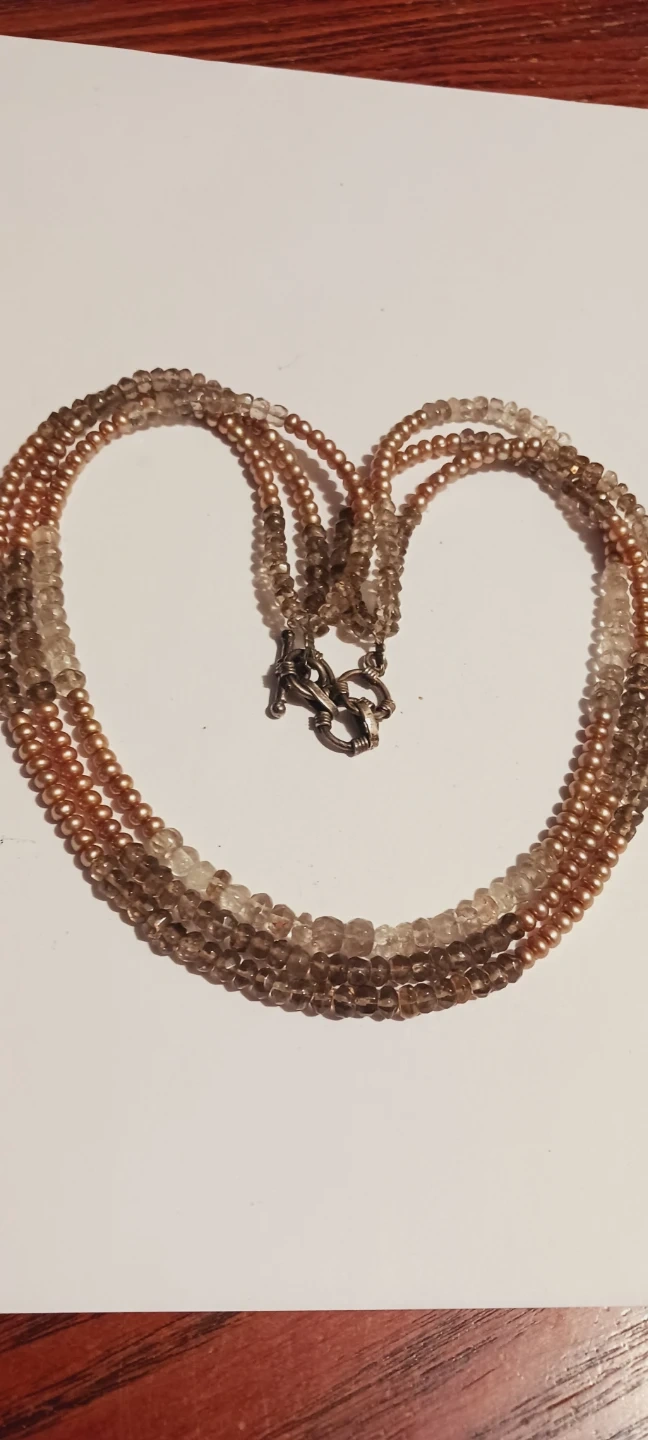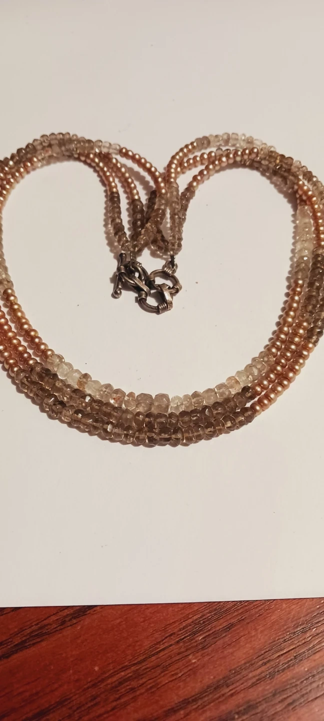 1000+STERLING SILVER 925 GENUINE FRESHWATER PEARLS AND GENUINE SMOKEY QUARTZ STONES BEADS MULTI STRAND BEADED NECKLACE..THE NECKLACE HAS A UNIQUE TOGGLE CLASP. It features a mix of light brown and clear beads. 18" long. Excellent condition. ALL MY PRICES ARE NEGOTIABLE !!
