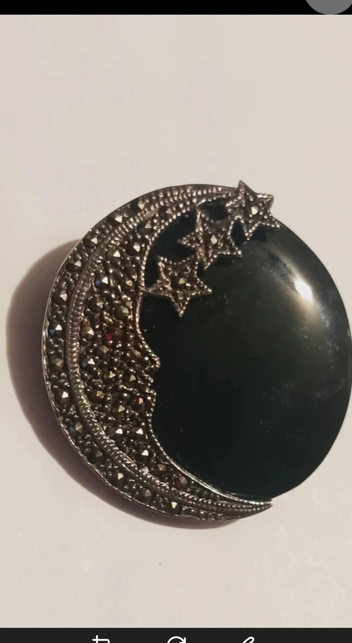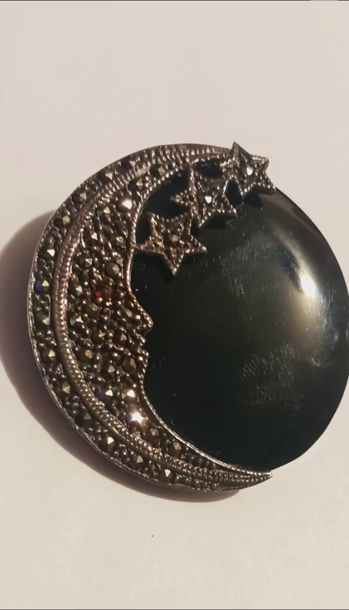 1000+Absolutely Gorgeous Vintage Sterling Silver 925 Marcasite Crescent ๐ Moon and Stars ๐ Brooch. Selling a vintage brooch featuring a crescent moon and stars design. It has a black onyx stone and marcasite accents. Marked '925' indicating sterling silver content. A unique piece for your jewelry collection !!! 1.5" diameter. Excellent condition. ALL MY PRICES ARE NEGOTIABLE !!!