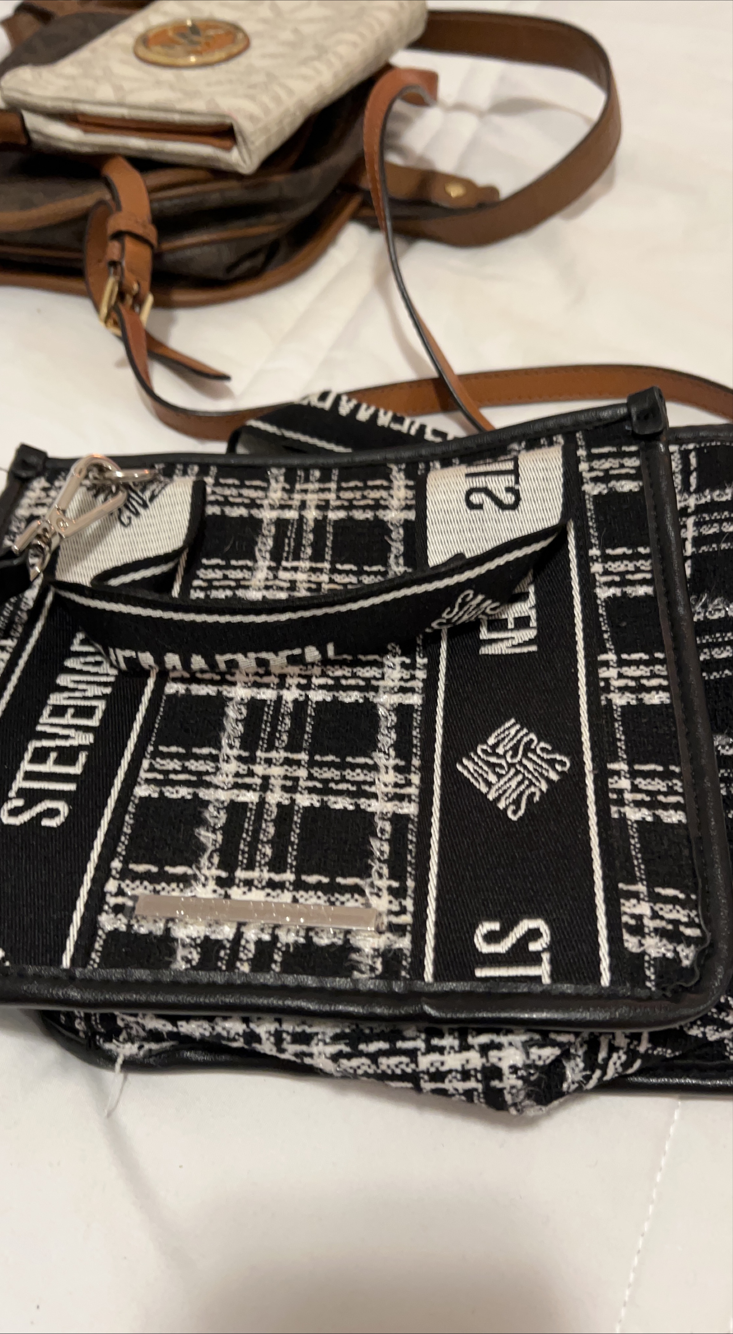 Selling a cute Steve Madden crossbody bag! It features a black and white plaid pattern with black leather trim and silver hardware. Perfect for adding a stylish touch to any outfit