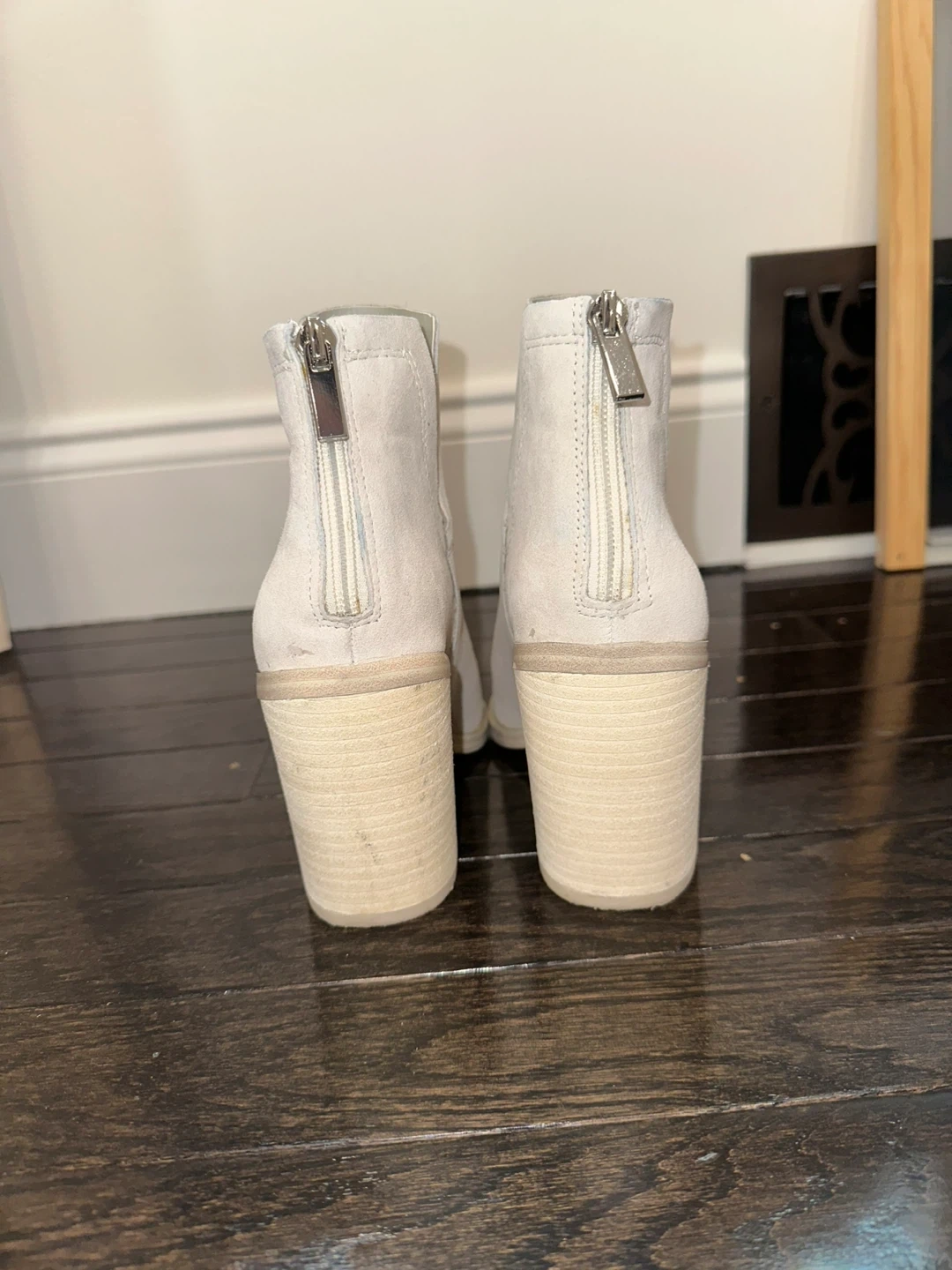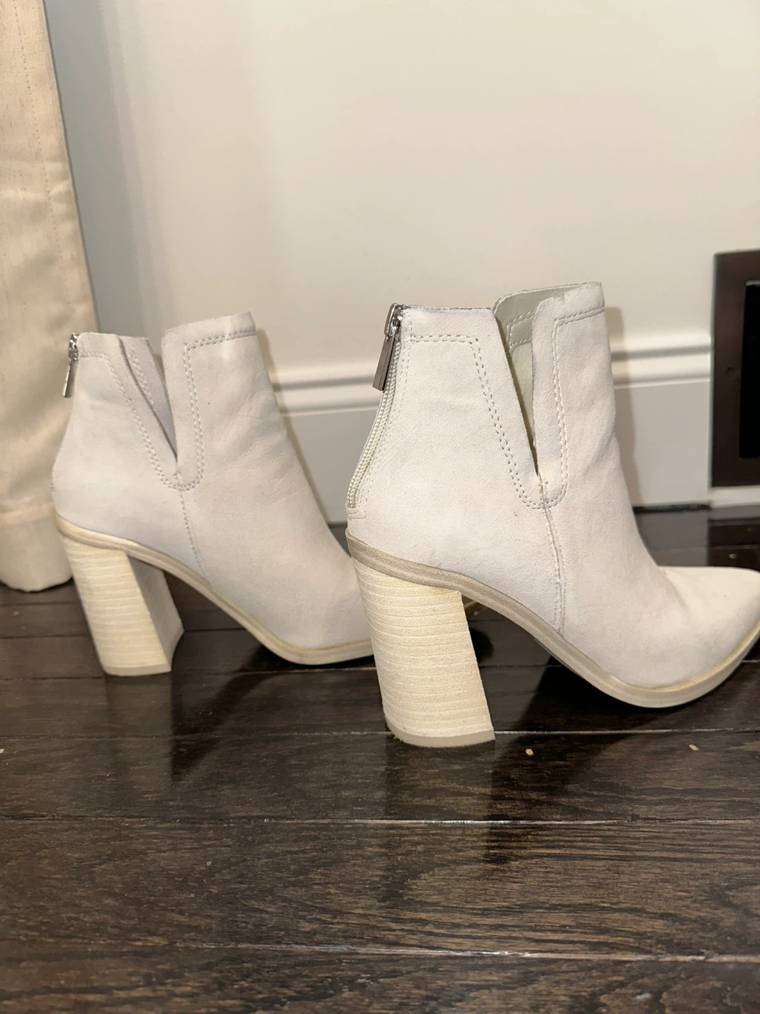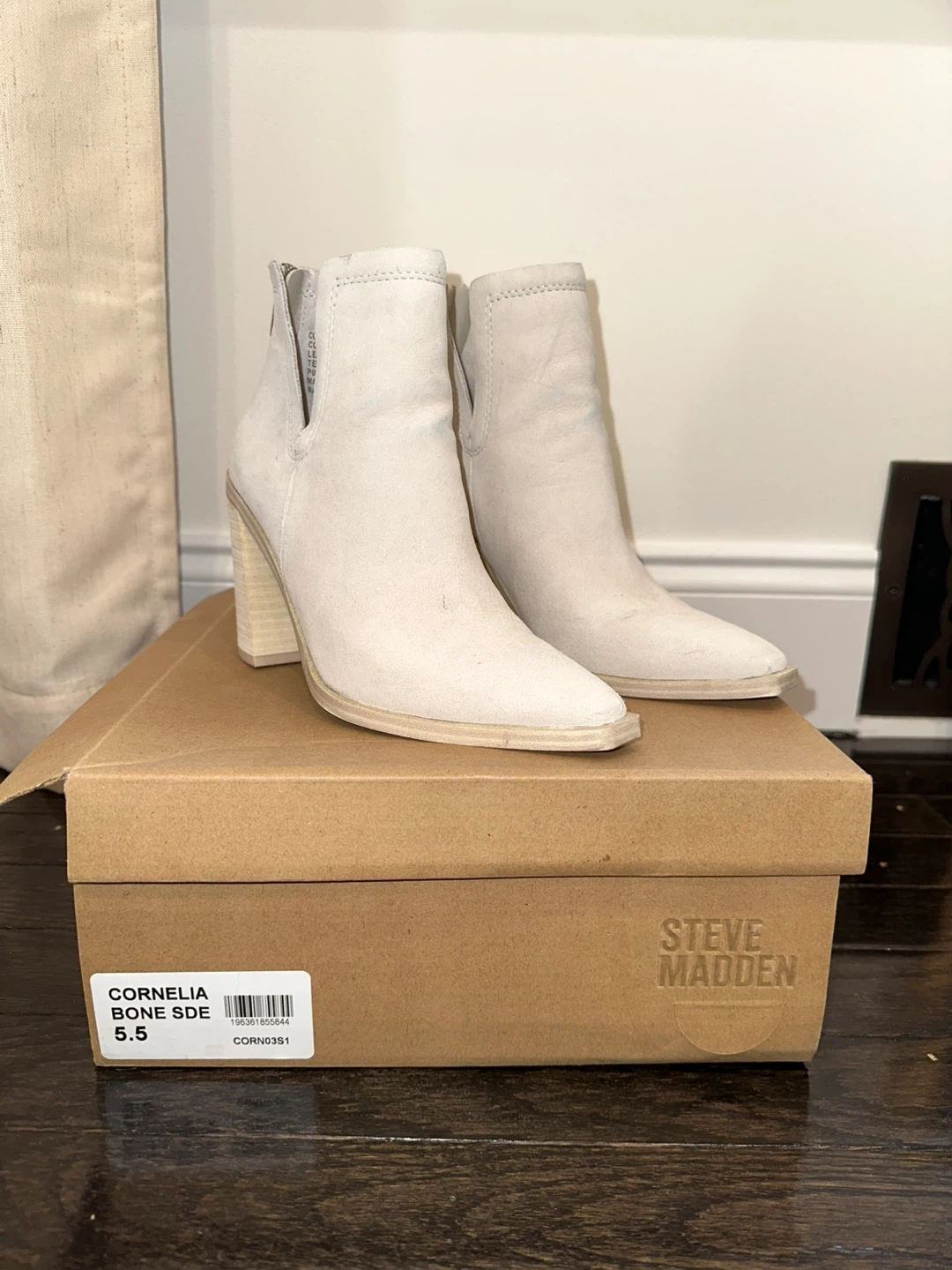 Selling a pair of lightly worn Steve Madden Cornelia booties in bone suede! They are a size 5.5 and come in the original box.