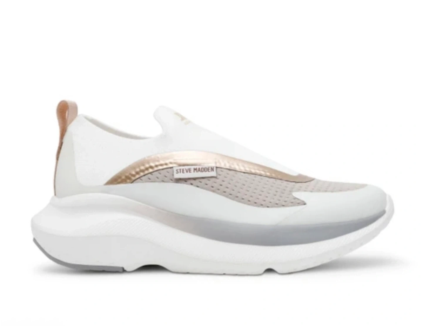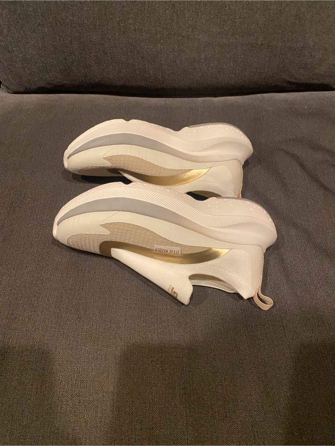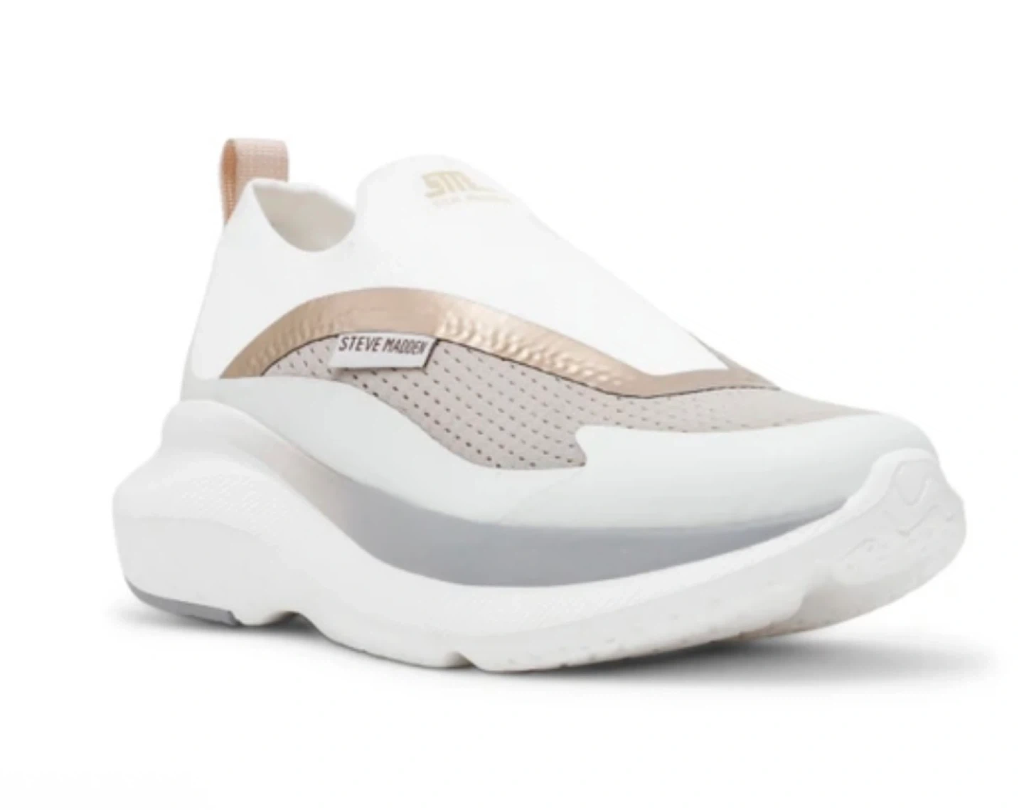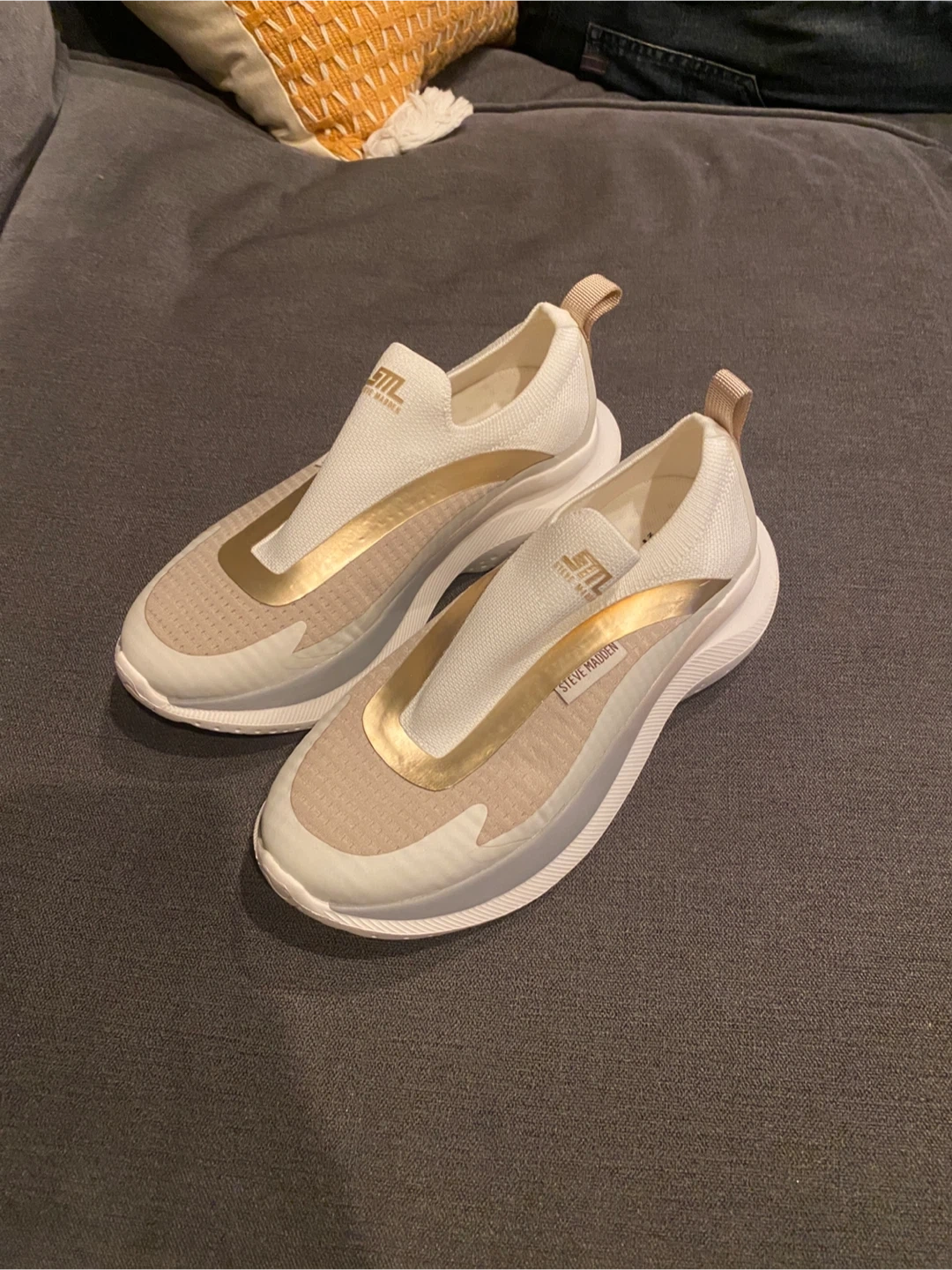Chic slip-on sneakers by Steve Madden. White base with stylish gold accents. Perfect for everyday wear. These slip-on design make sure your feet stays snug while they walk or run. These comfortable styles are super quick to slips on and off with ease, they feel extremely light at the top.