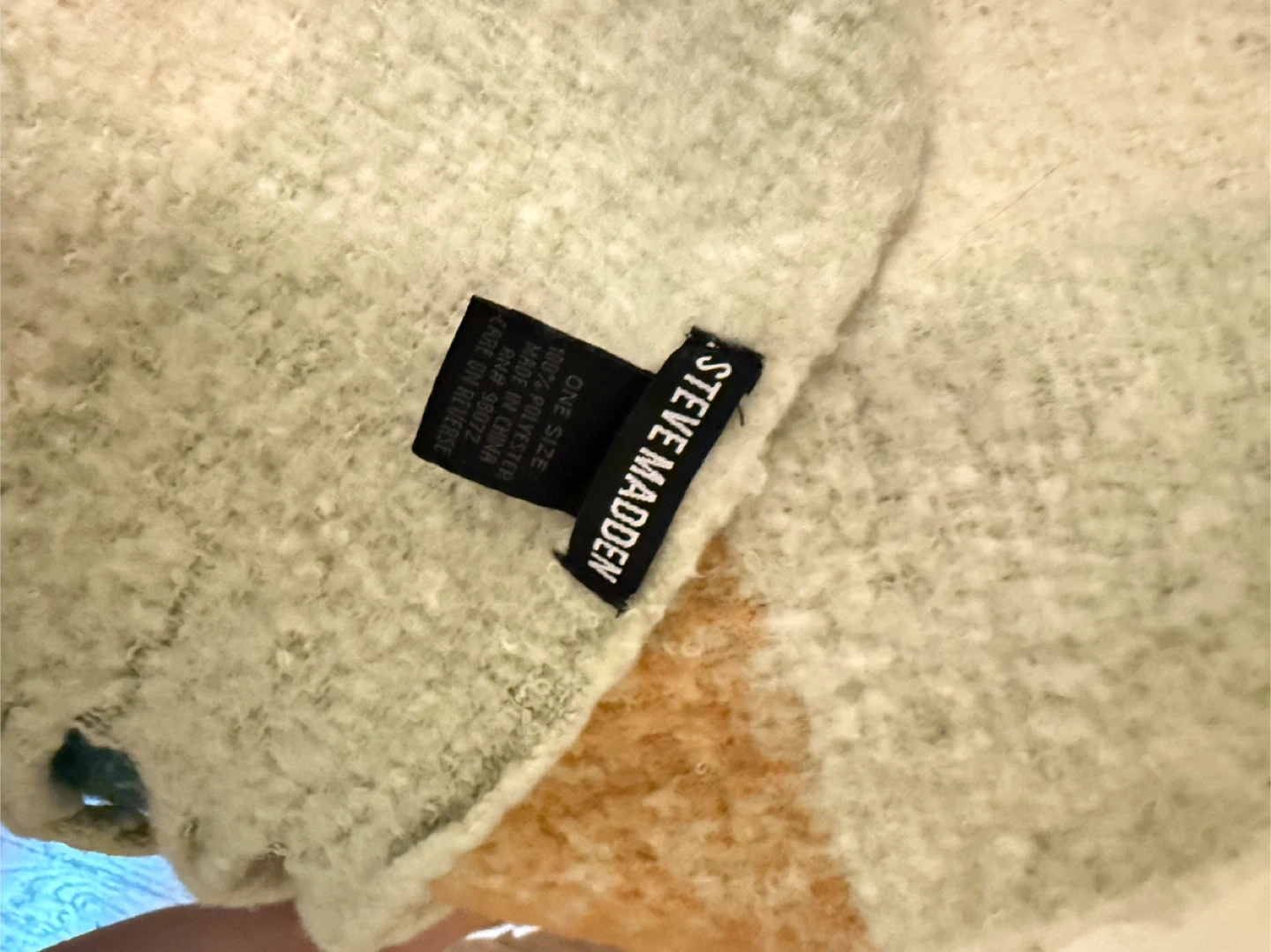 Cozy up with this Steve Madden blanket scarf! It features a stylish plaid pattern in shades of green, white, orange, and blue. Perfect for adding a touch of warmth and style to any outfit. One size fits all!