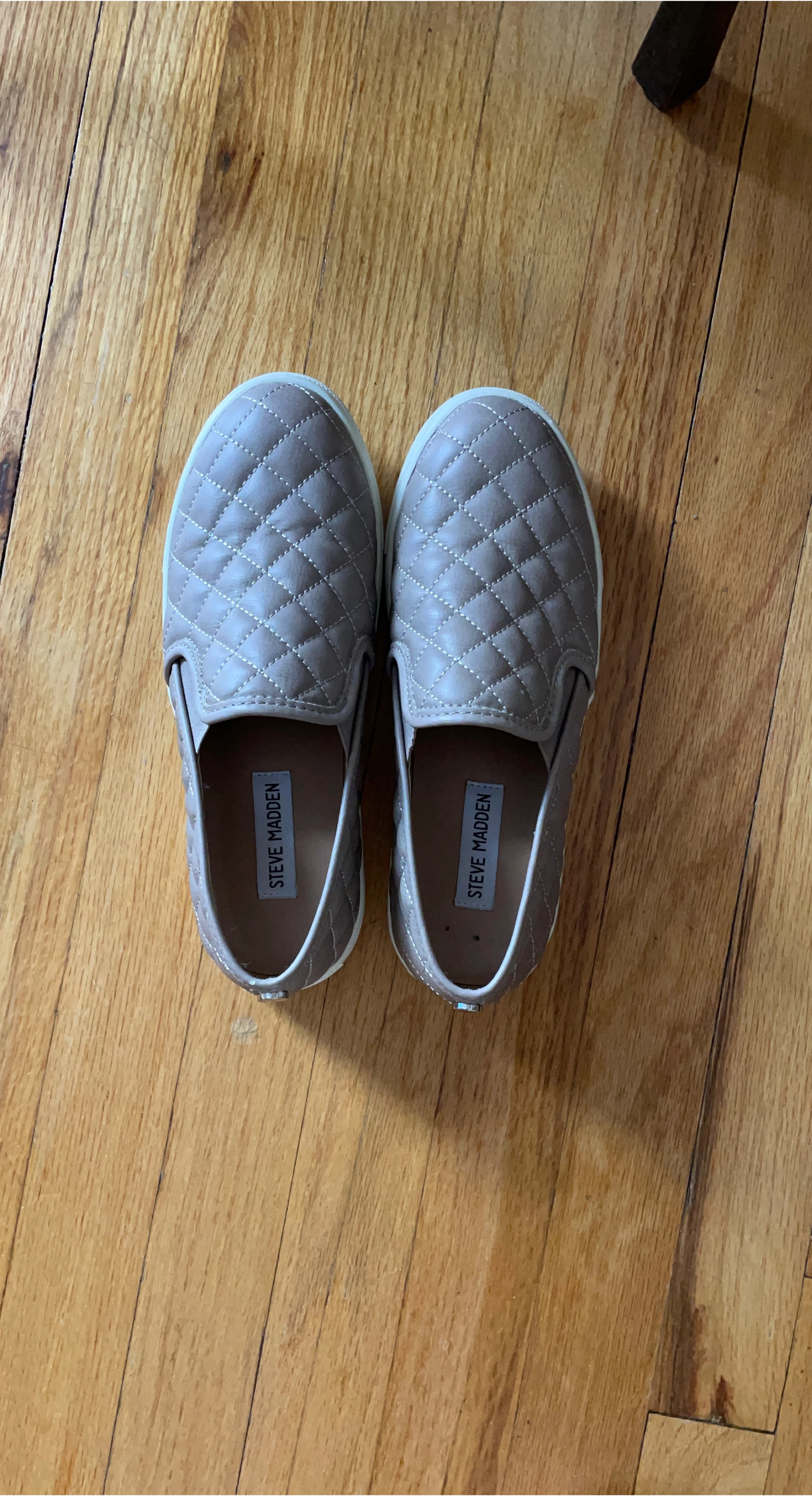 20Selling a pair of Steve Madden slip-on sneakers! They feature a quilted design and are in good condition. Size 6 These have been worn once but were too small.