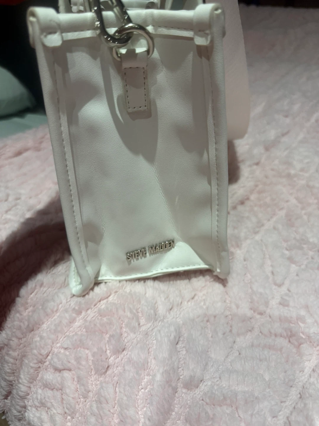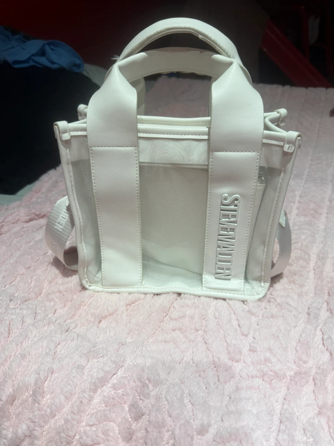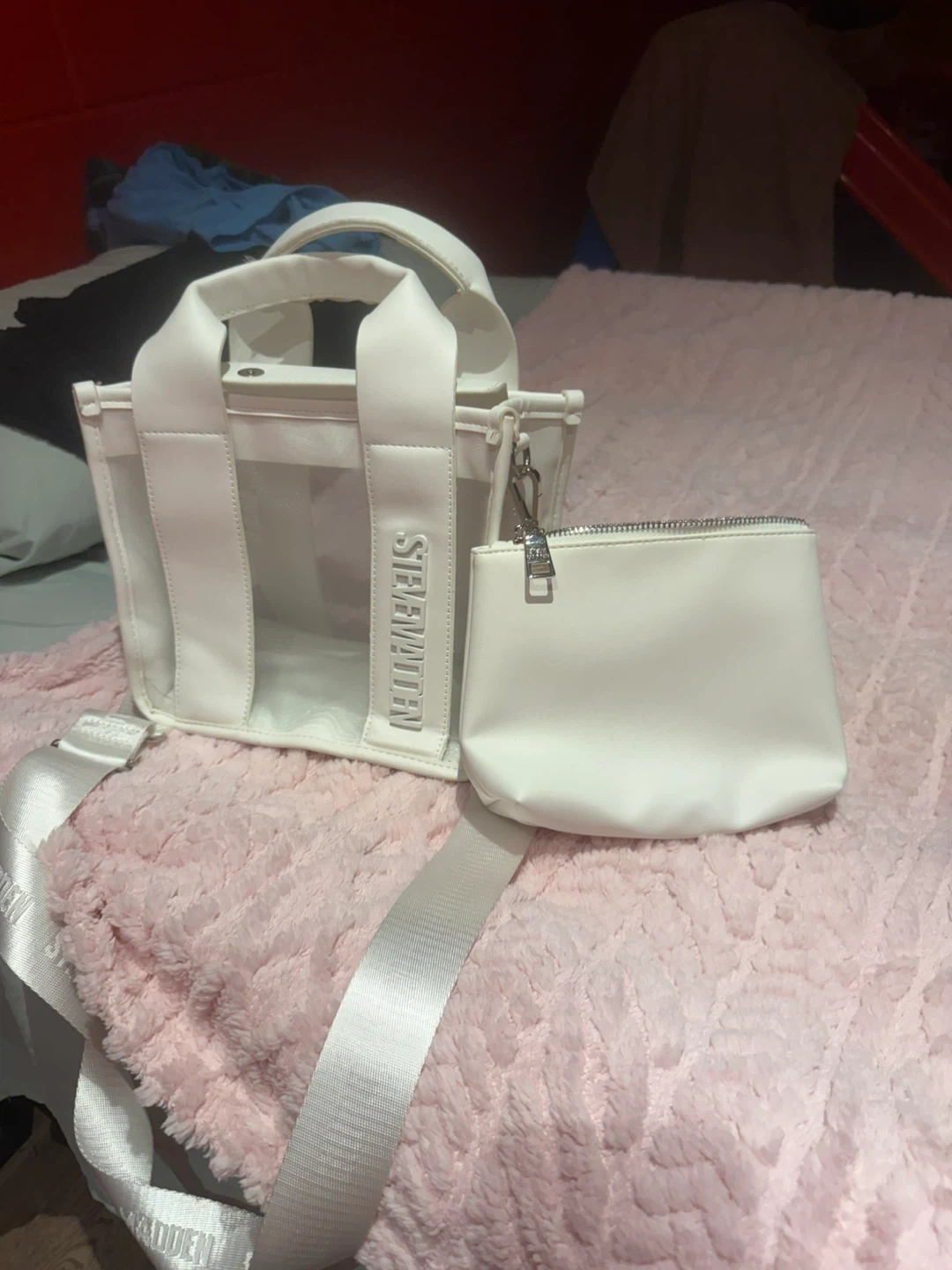 Selling a stylish Steve Madden tote bag in white! It comes with a detachable pouch, perfect for keeping your essentials organized. The bag features a clear design and a comfortable strap. Great for everyday use!