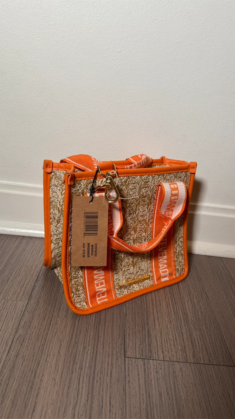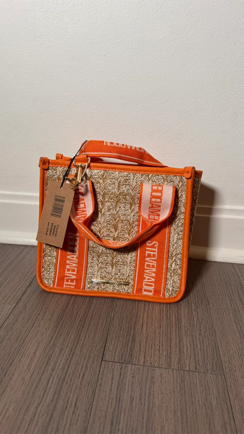 This is a cute Steve Madden woven tote bag with orange accents! It's perfect for carrying your essentials in style