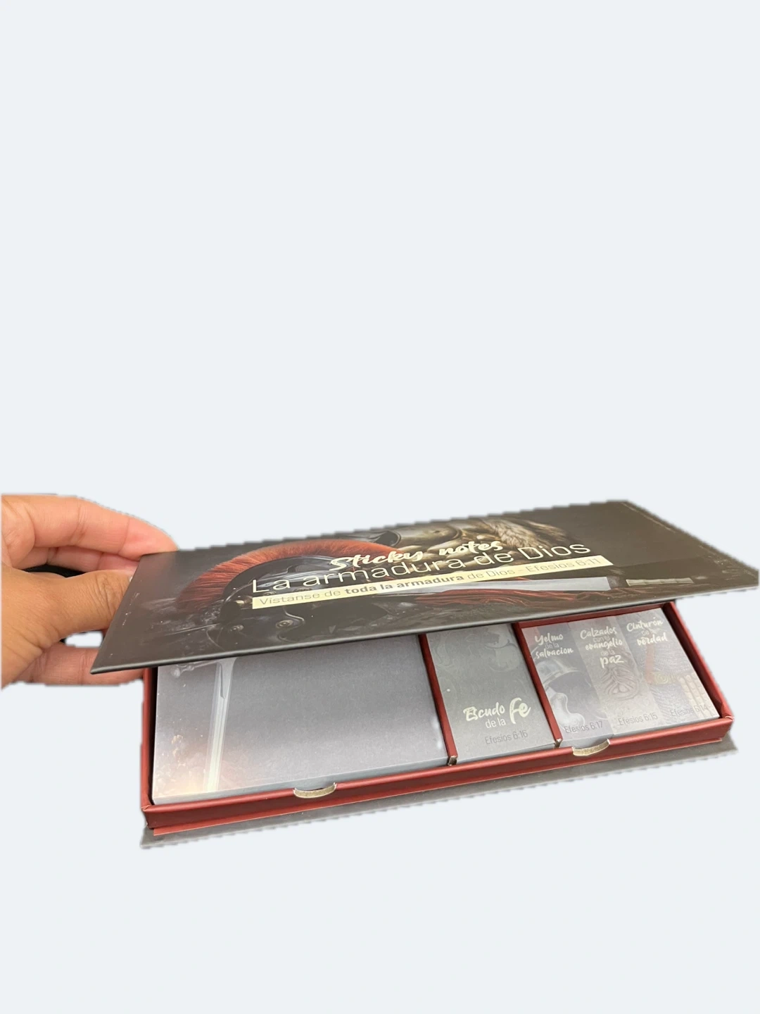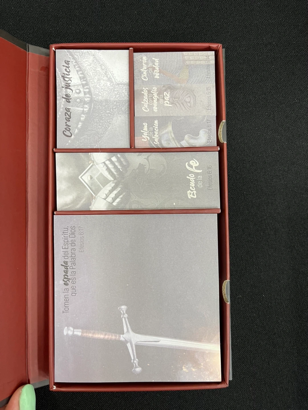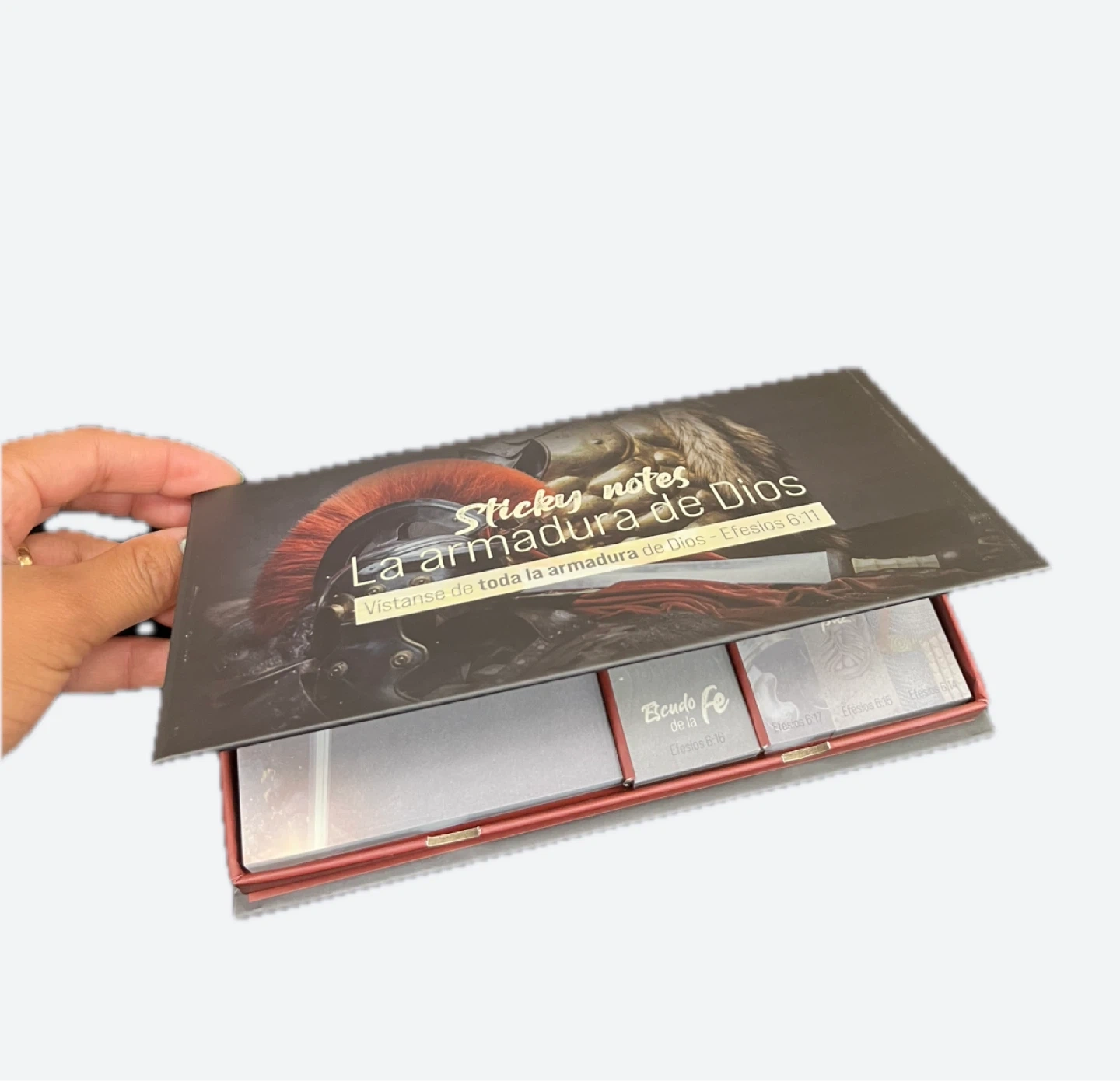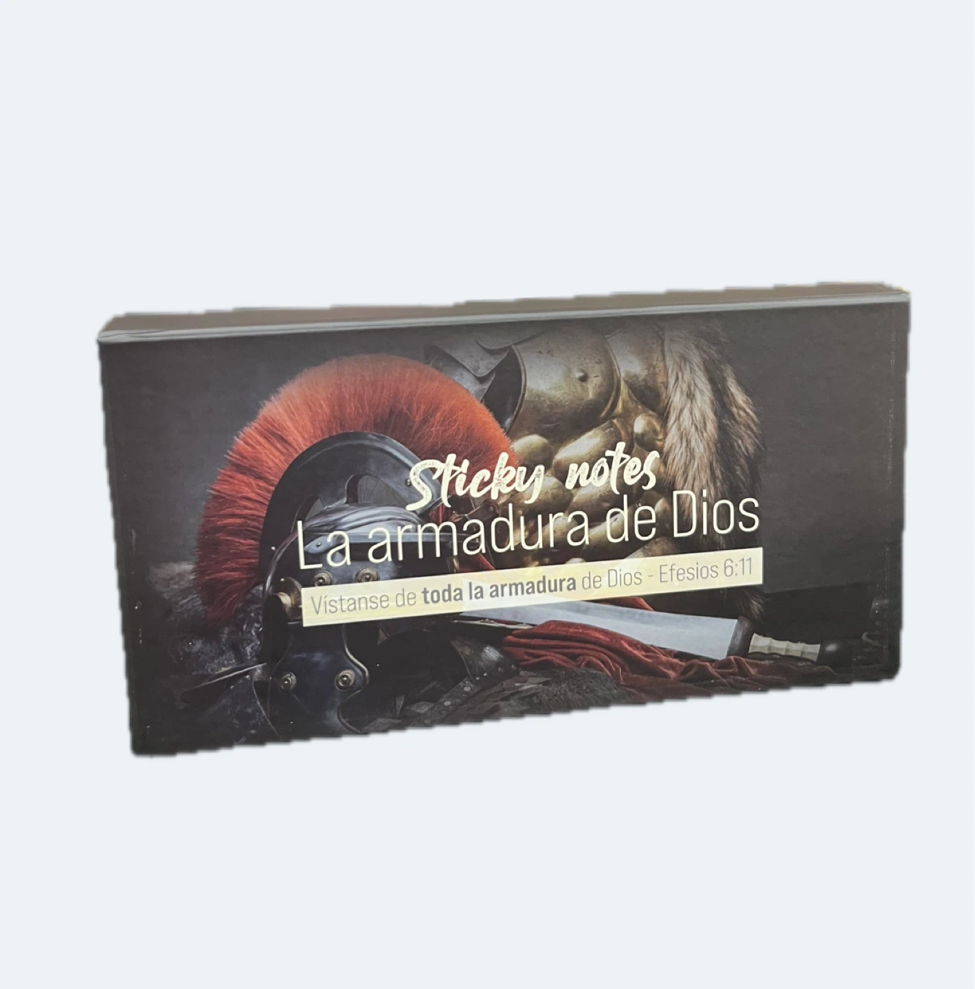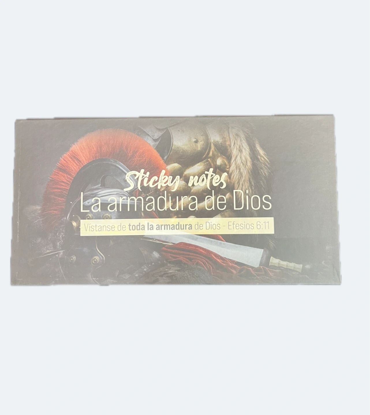 15Selling a set of sticky notes titled "La armadura de Dios" (The Armor of God) The sticky notes feature different aspects of the armor of God, such as: - Coraza de justicia (Breastplate of righteousness) - Yelo de salvación (Helmet of salvation) - Calzados evangelio verdad paz (Shoes of the gospel of peace) - Escudo de la fe (Shield of faith) - Tomen la espada del Espiritu, que es la Palabra de Dios (Take the sword of the Spirit, which is the Word of God)