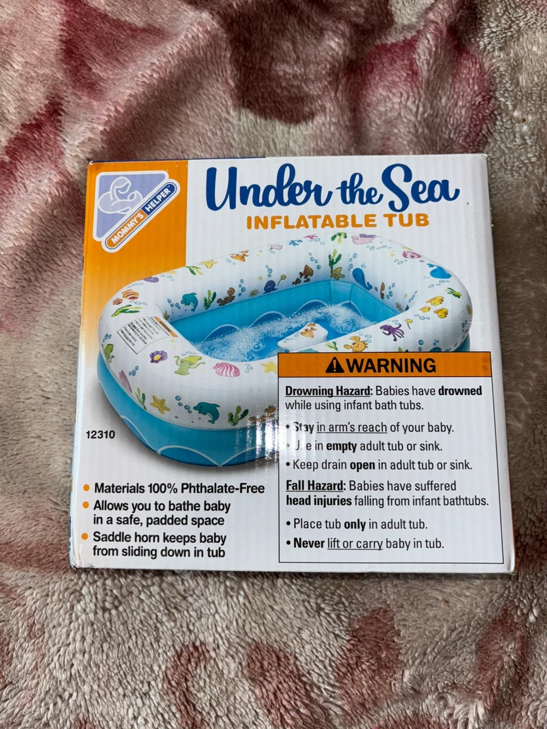 This is the Mommy's Helper Under the Sea inflatable tub. It's made from 100% phthalate-free materials and includes a saddle horn to help keep your baby from sliding down. Allows you to bathe baby in a safe, padded space. Gently used a few times.