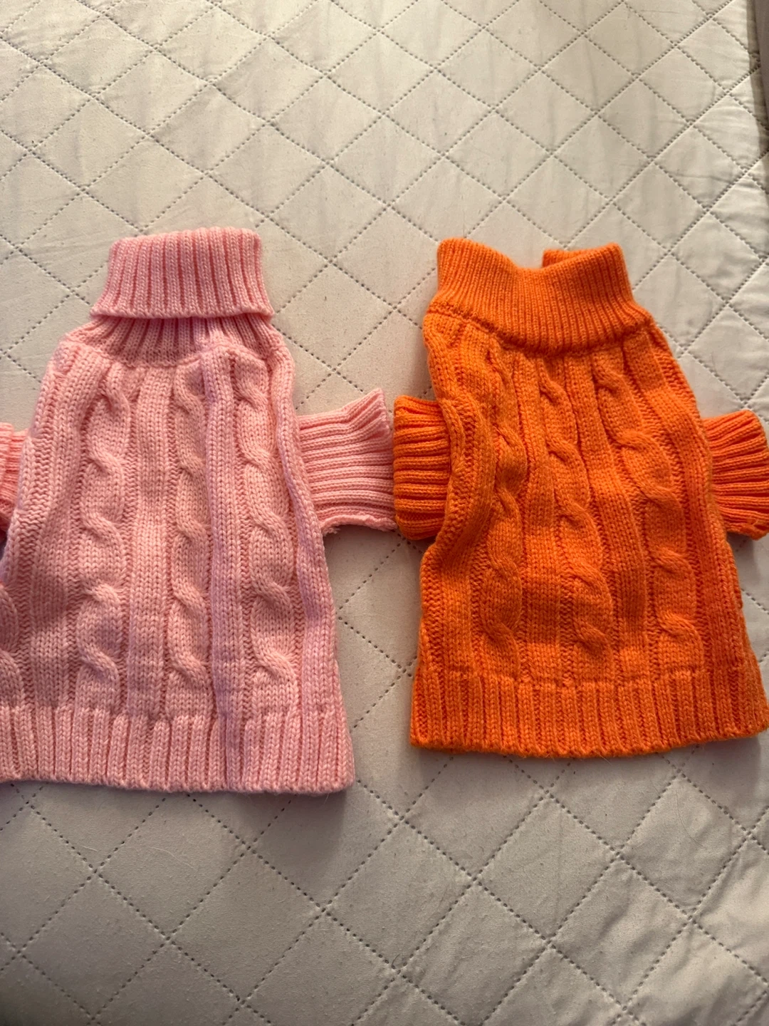 247Selling two adorable dog sweaters from Stinky G! One is a vibrant orange and the other is a soft pink. They are both size 8 and made of 100% acrylic to keep your furry friend warm and cozy.Its like new!