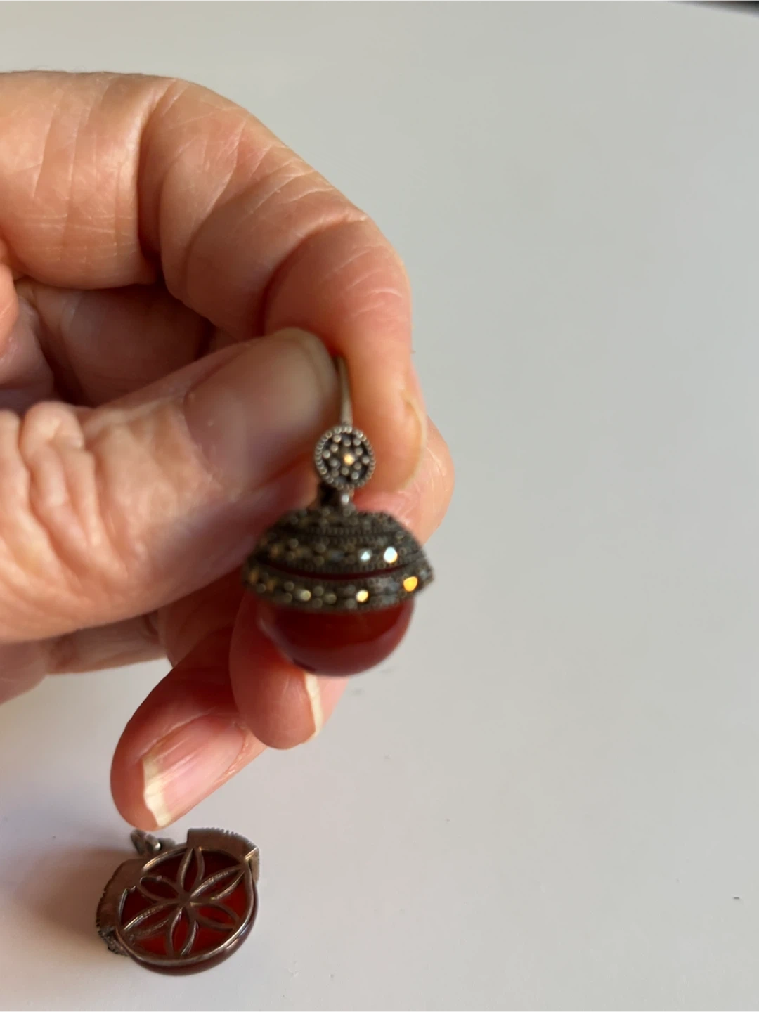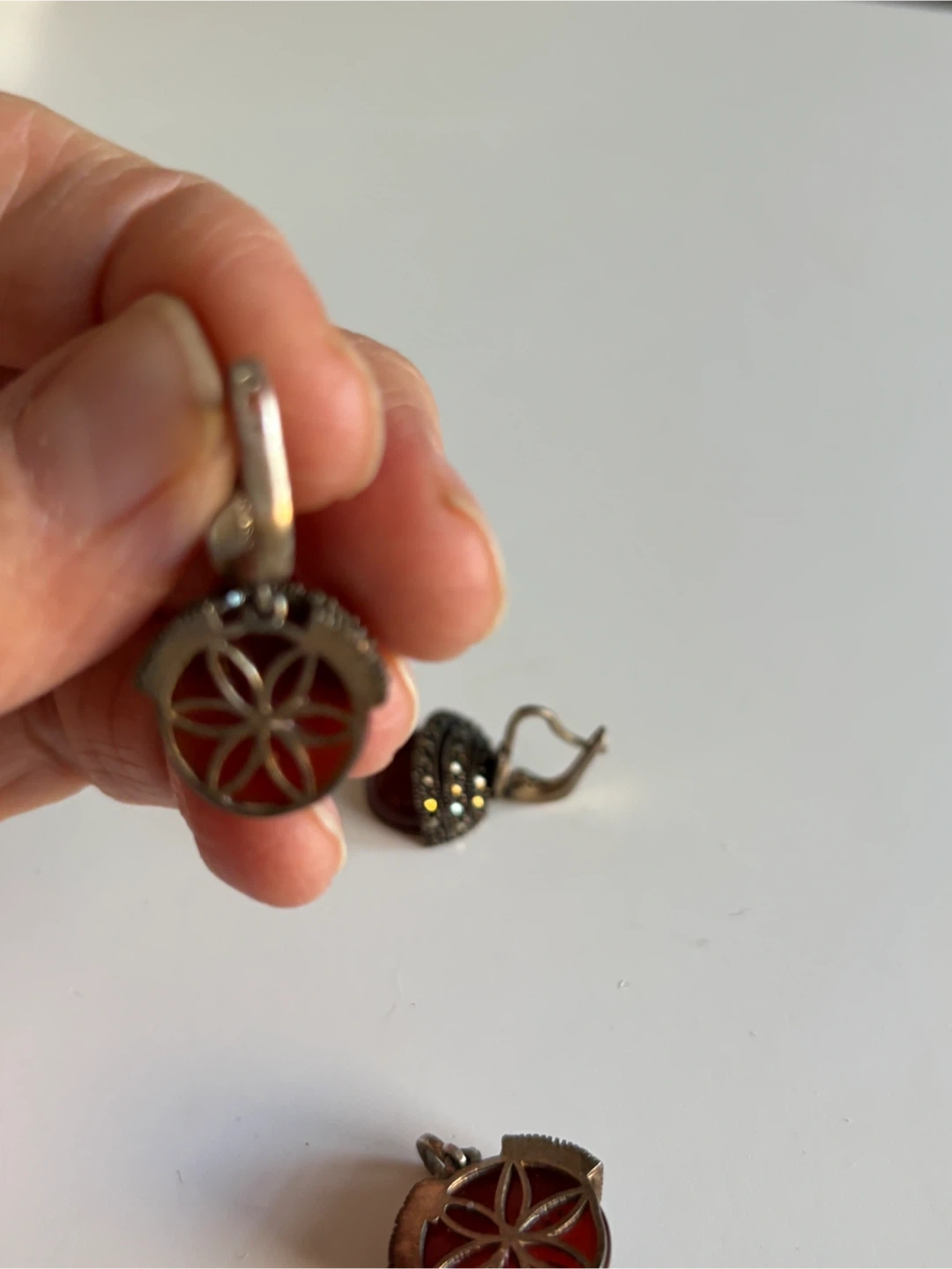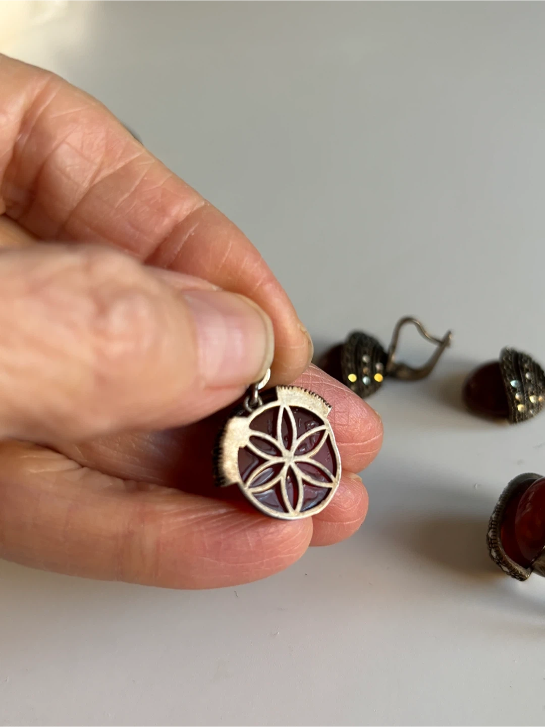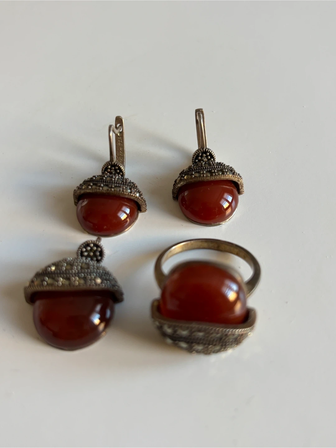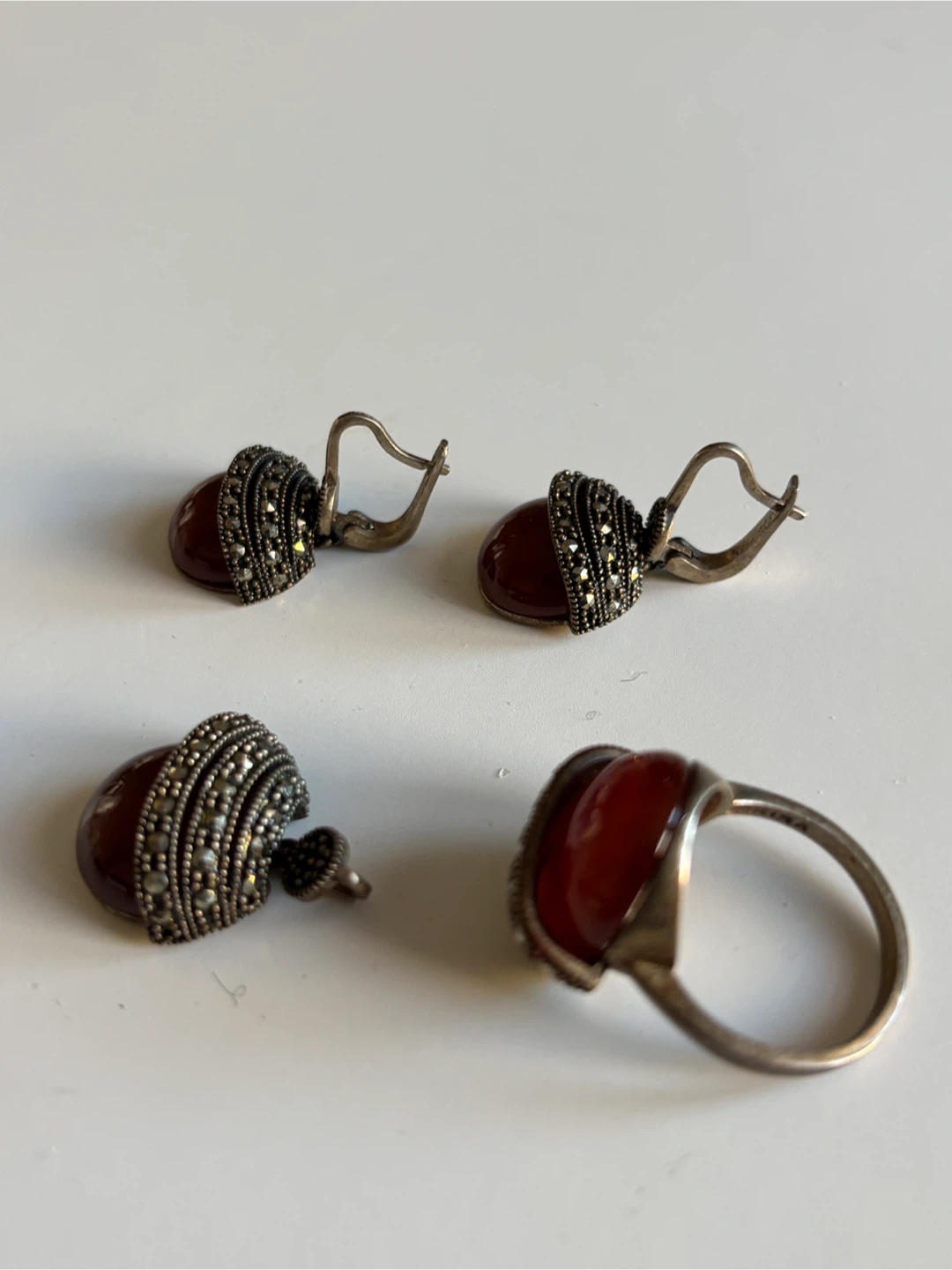 This set includes a pair of vintage earrings and a matching ring. Each piece features a deep red carnelian stone accented with marcasite details and intricate silver metalwork. The earrings have lever-back closures, and the ring showcases a unique acorn-like design.