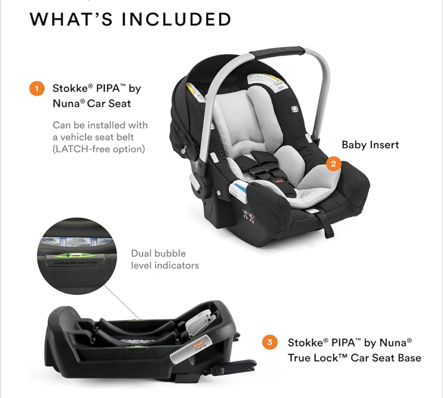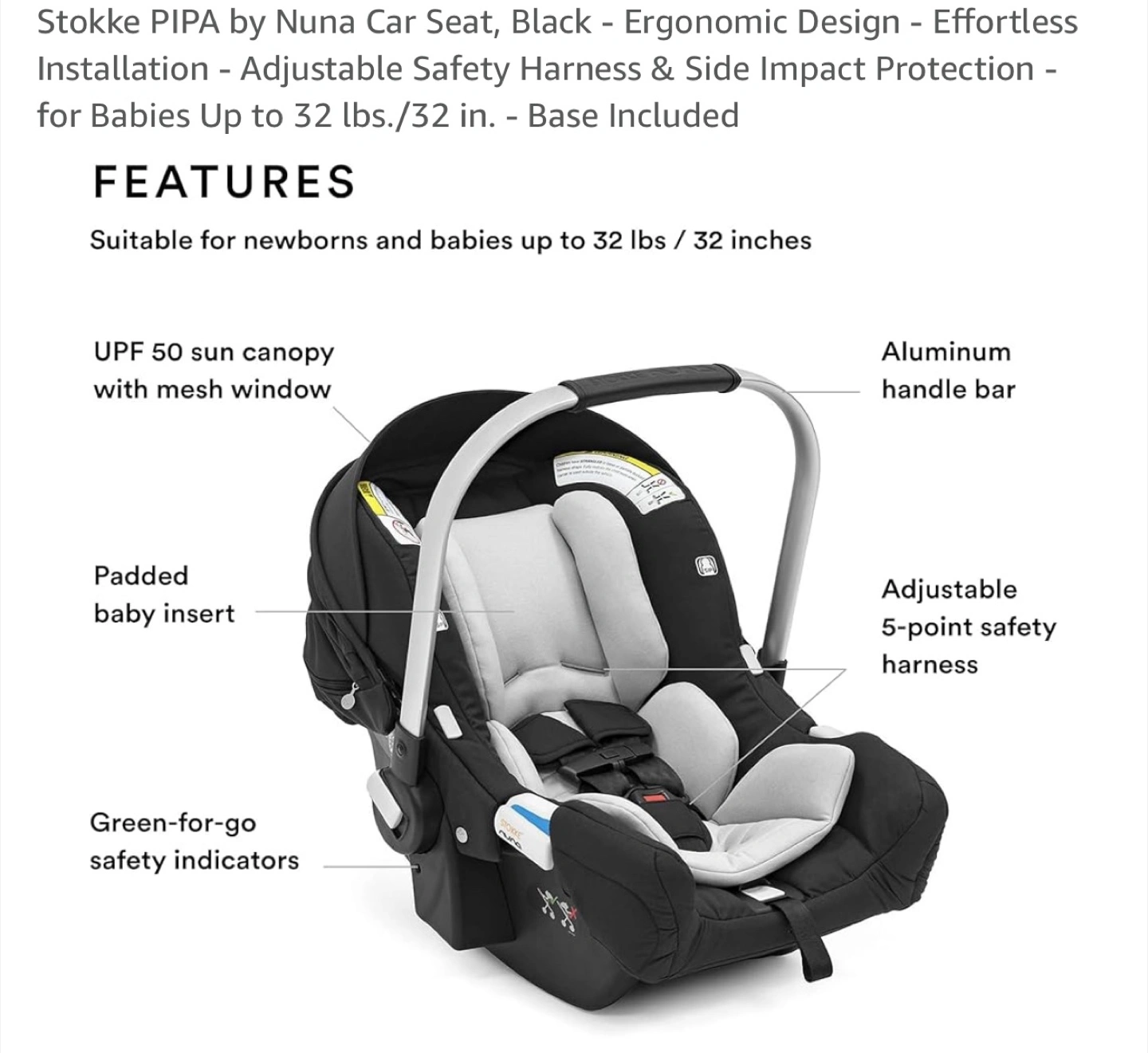 Stokke PIPA by Nuna Car Seat, Black - Ergonomic Design - Effortless Installation - Adjustable Safety Harness & Side Impact Protection - for Babies Up to 32 lbs./32 in A car seat, suitable for newborns and babies. Includes a base with dual bubble level indicators and a sun canopy with a mesh window. A perfect item to keep your little one safe on all your travels.