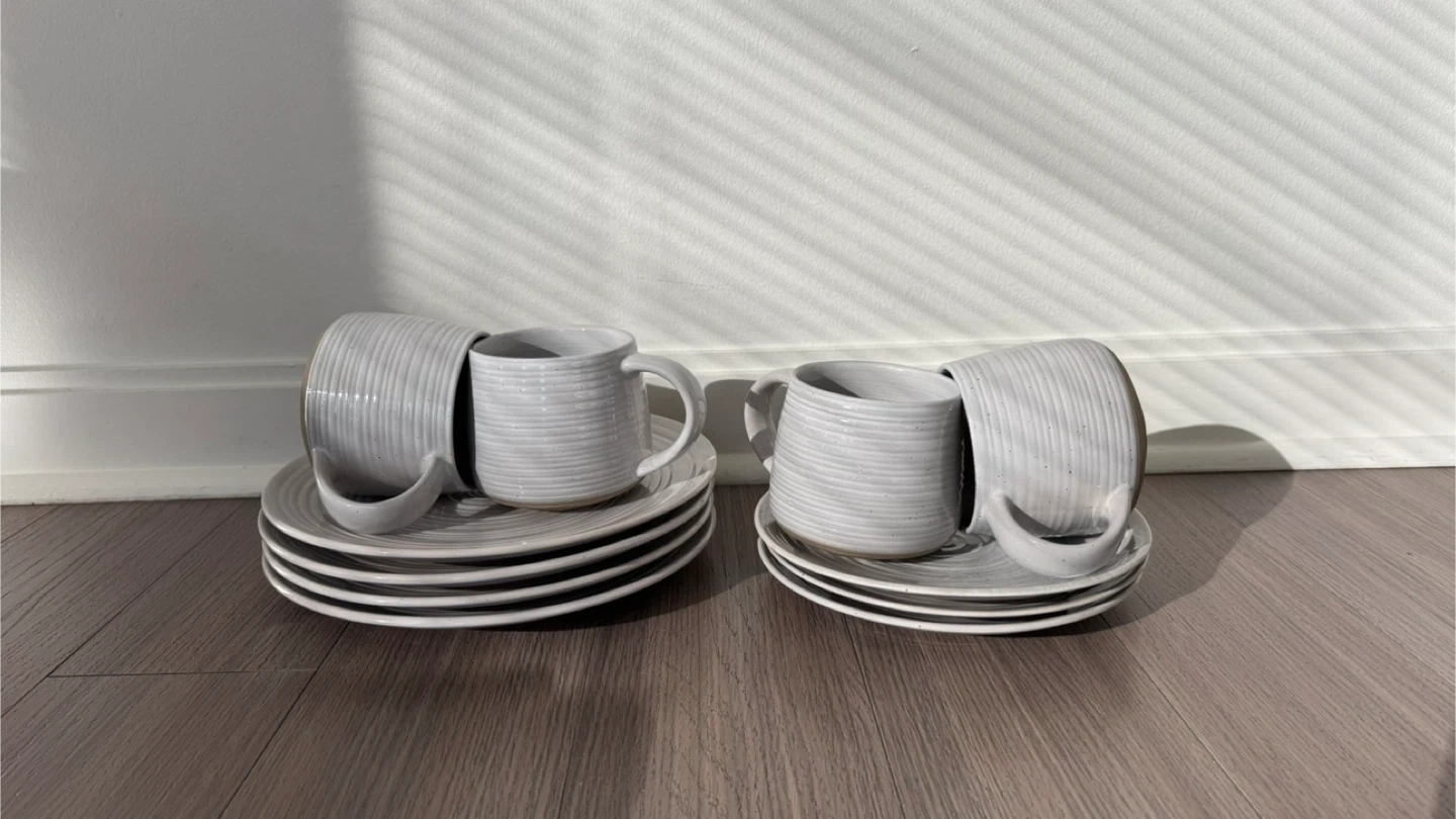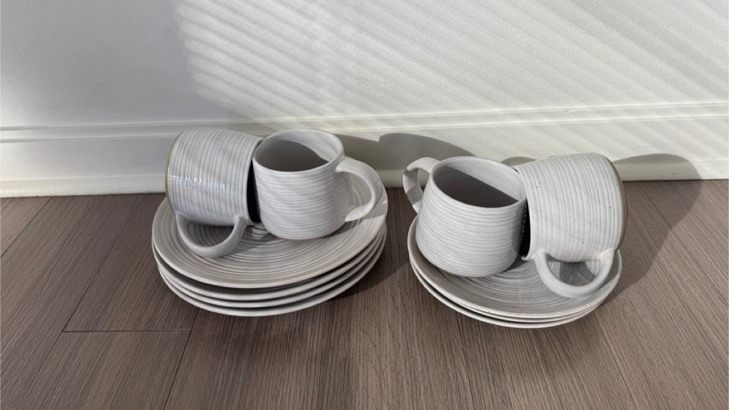 23Selling a set of stoneware mugs and plates. They are in great condition and perfect for everyday use. The set has a simple, elegant design that will look great in any kitchen. The neutral color will match any decor