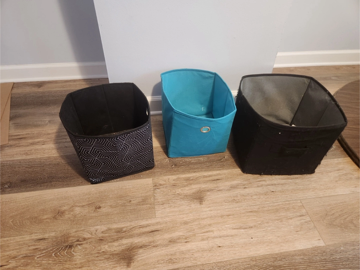 25Selling three storage bins! There's a black one, a blue one, and one with a black and white pattern. Great for organizing! Fit into Target or Ikea cube storage.