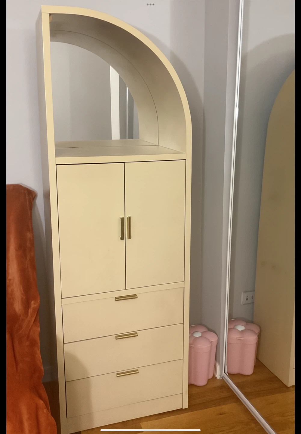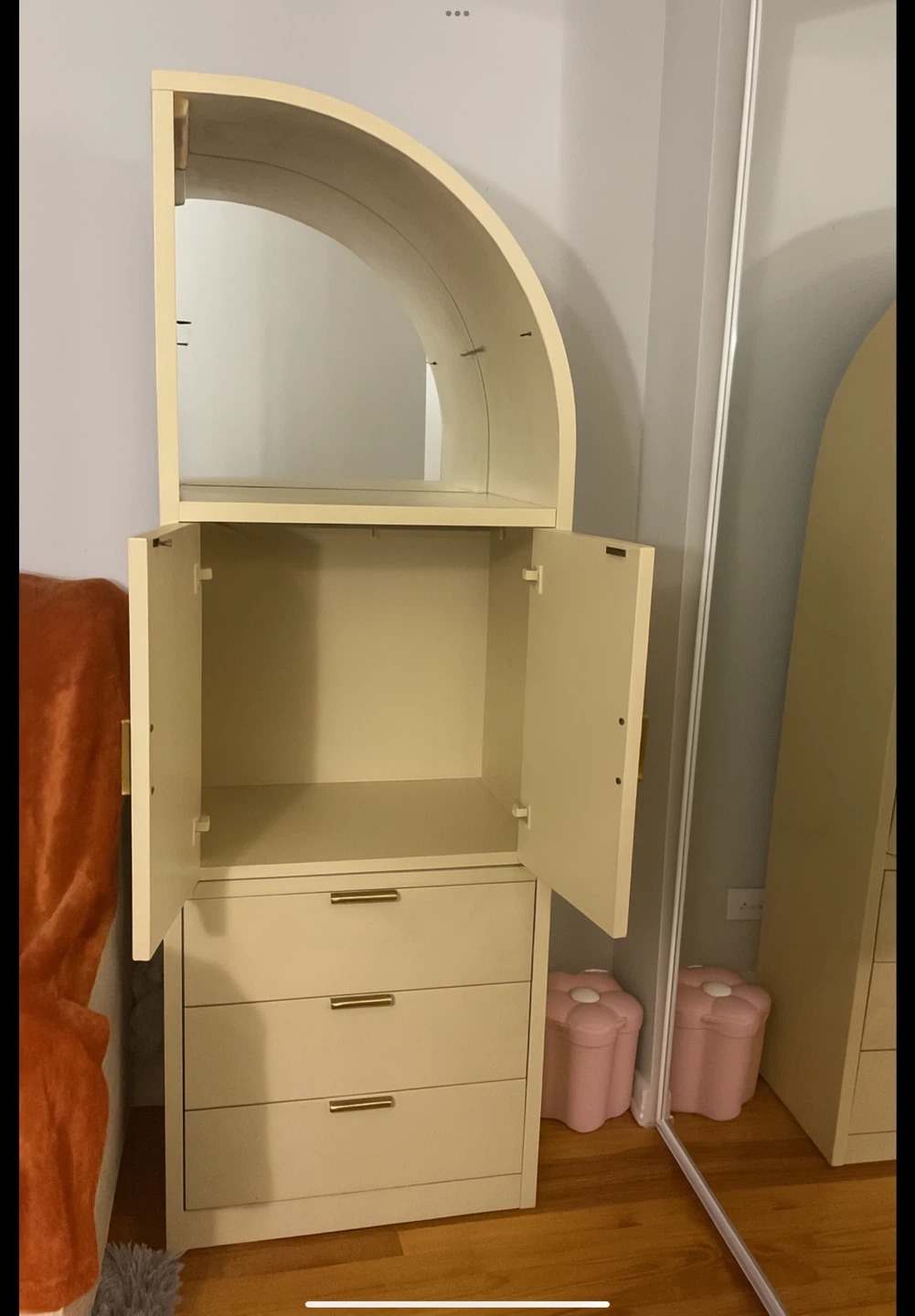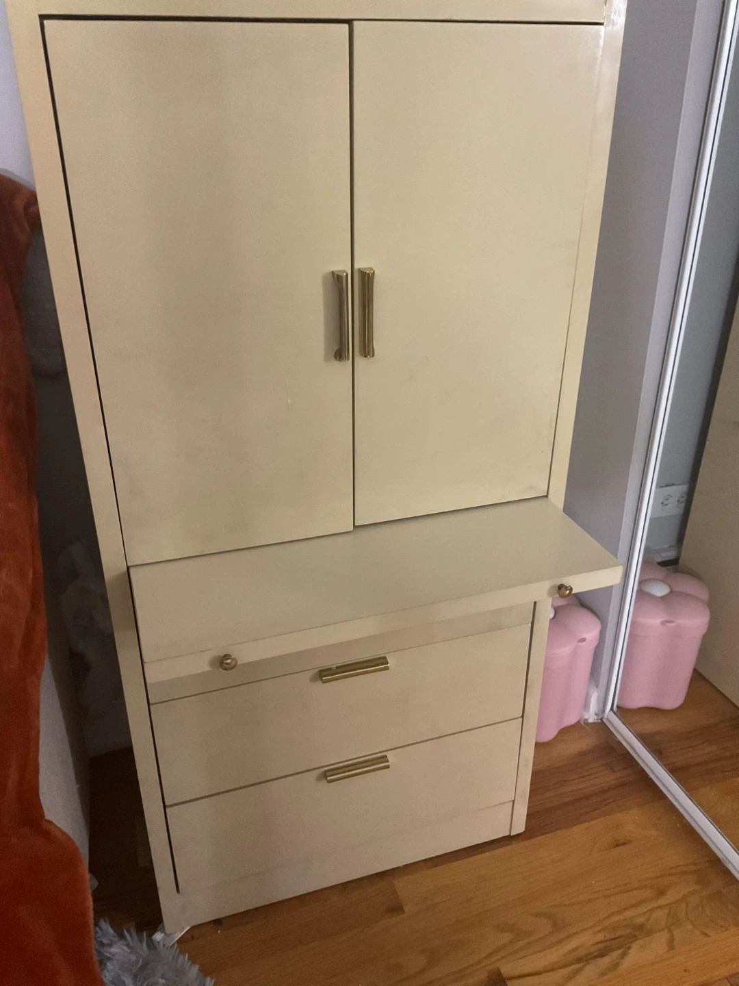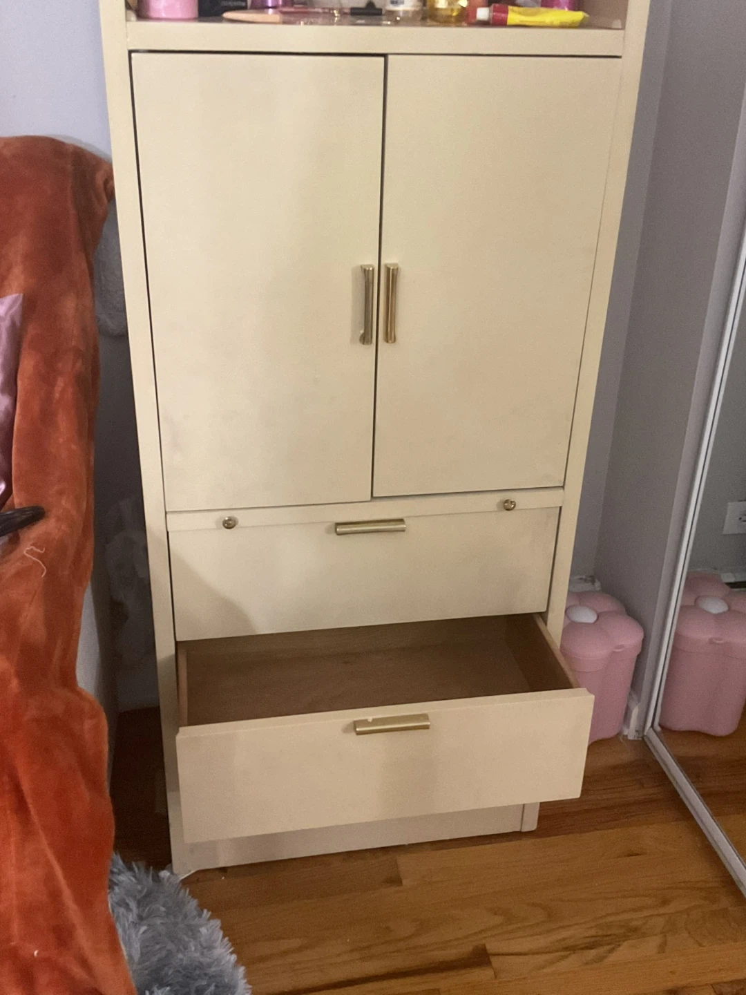 This is a lovely off-white storage cabinet. It features both cabinet space and drawers for versatile storage options. It is heavy and very sturdy! Ready to negotiate the price if interested.