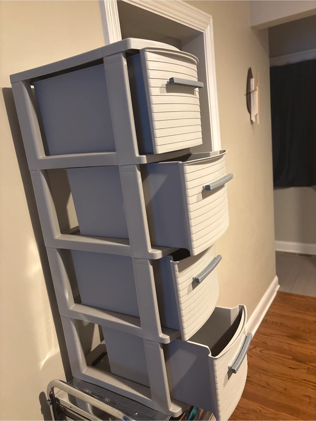 This is a handy storage cart with four drawers! It's perfect for organizing small spaces. The drawers are a light gray color and have handles for easy opening and closing. The cart is on wheels, so it's easy to move around Was using it for shoe storage