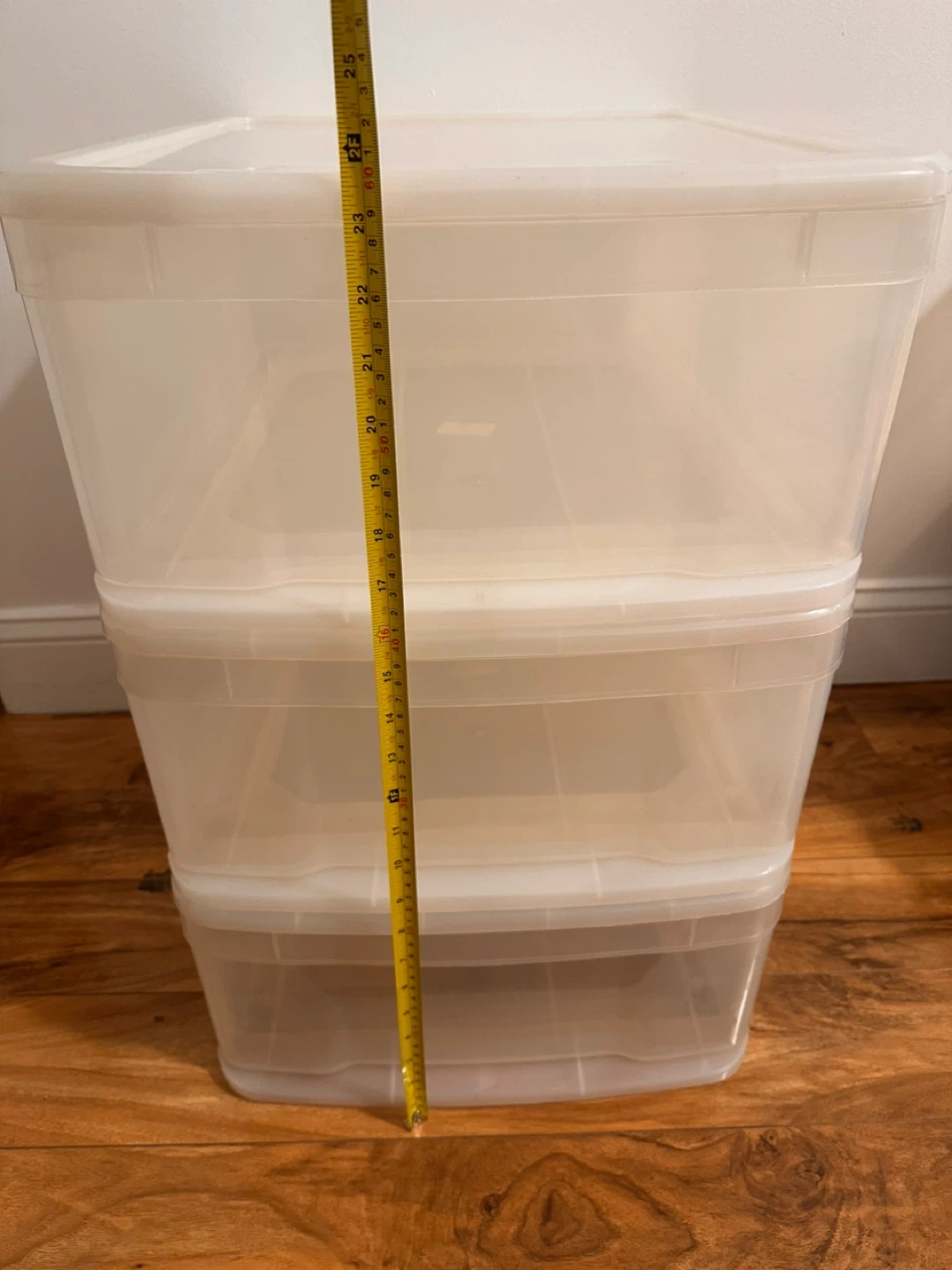 Selling a set of three clear storage containers with lids. Each container is approximately 25 inches tall. Great for organizing your home!