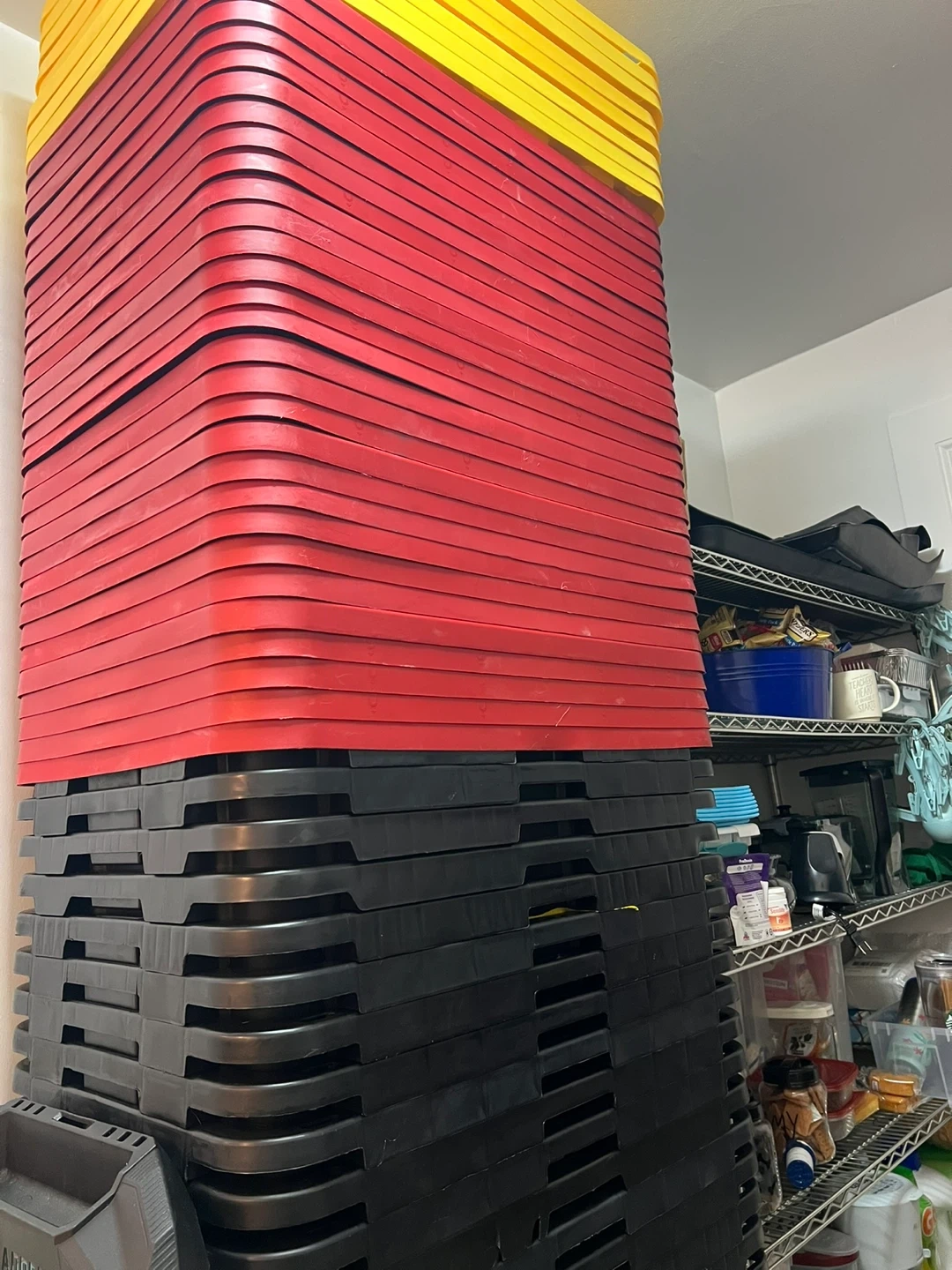 10Selling a collection of storage totes in red, black, and yellow. Great for organizing your home or garage!