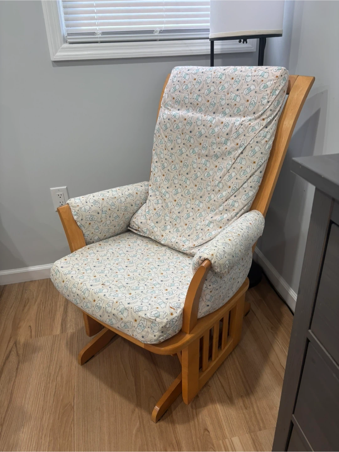 151Selling a Storkcraft Tuscany Glider Rocker. It's in great condition and features a comfortable design for relaxing. The glider smoothly rocks back and forth, perfect for nurseries or any cozy space. I sewed on the Pooh fabric and underneath the Pooh fabric is green