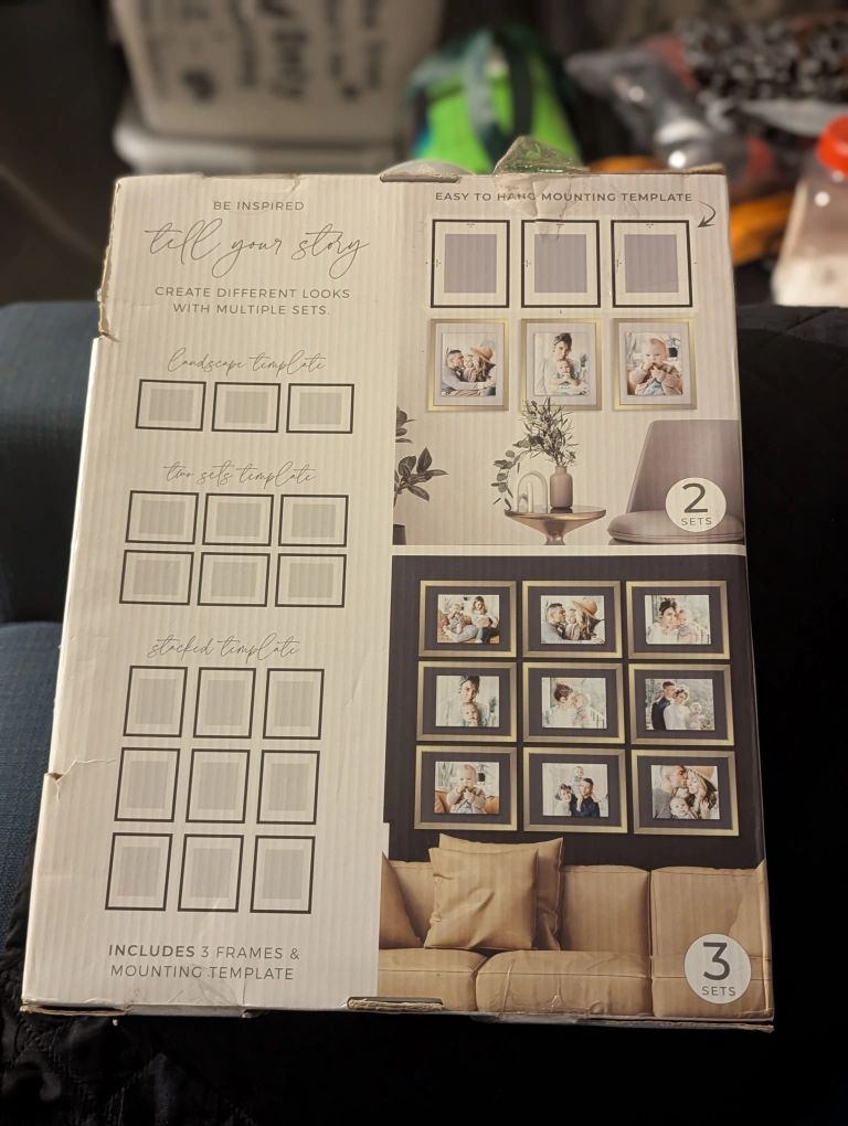 3 Gold frames with mounting template. Size: 11 x 14 inch Floating to 8 x 10 Brand New in Box Retail Value: $29.99