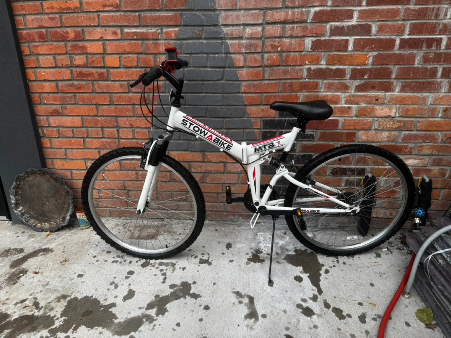 Selling a Stowabike MTB26 folding mountain bike. It's white with red accents and has a black seat. Great for easy storage and transport!