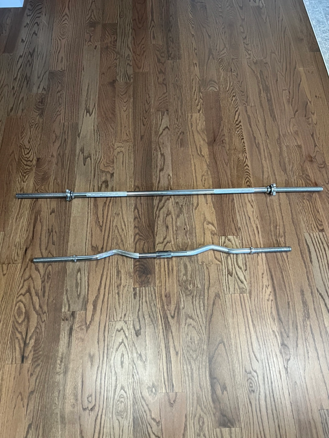60Chrome weightlifting bars. One straight bar and one EZ curl bar. Barbell 60” (1” diameter) with metal 2 metal clamps -$25 Ez curl barbell (1” diameter) with 2 metal clamps 47” $20 Good condition.
