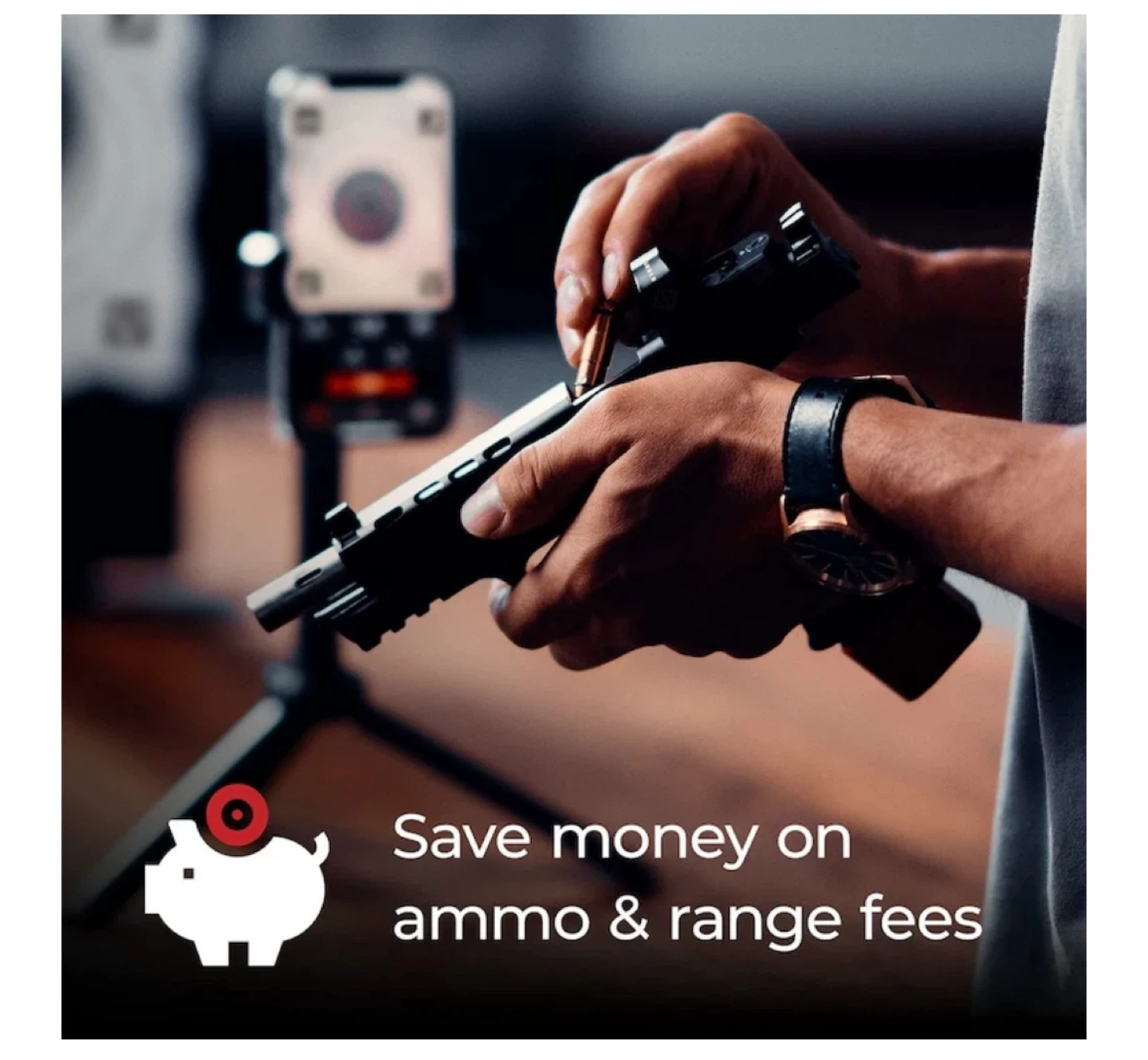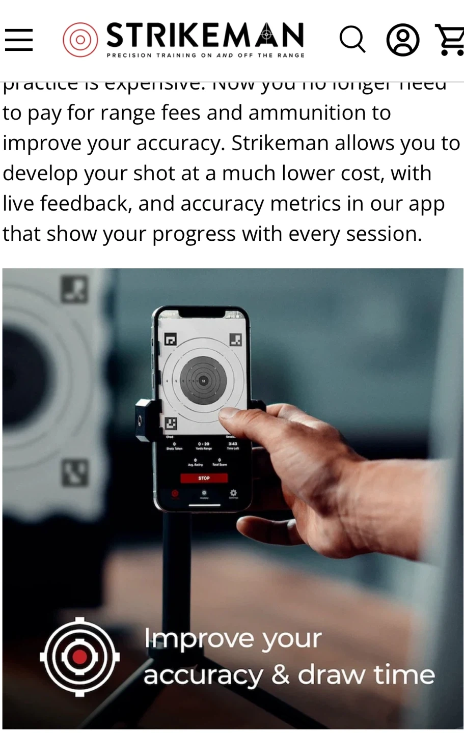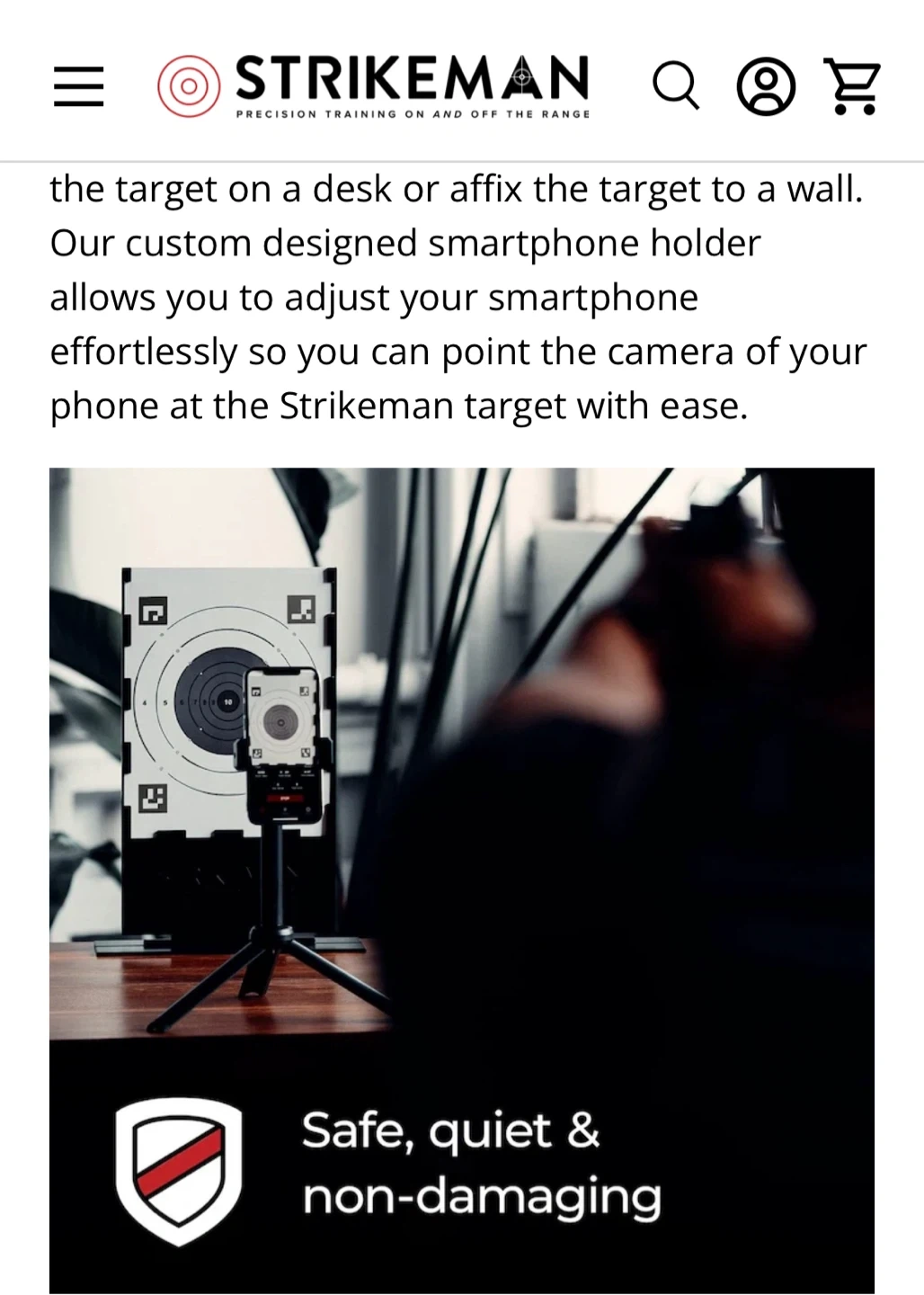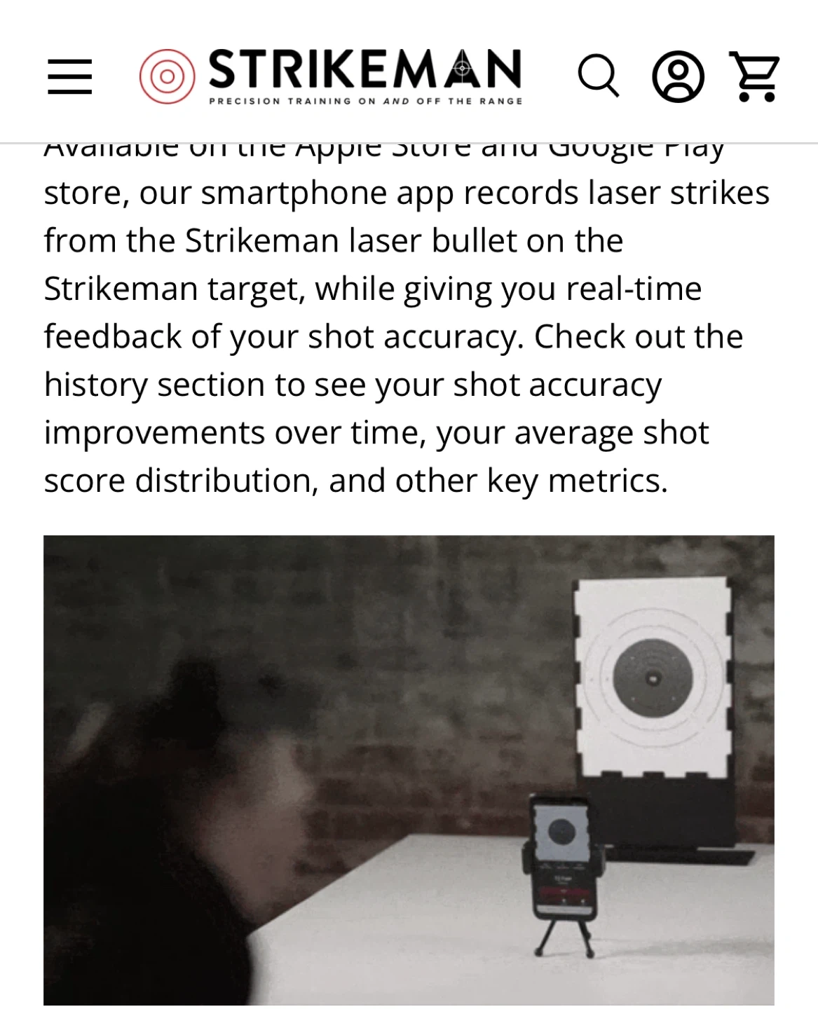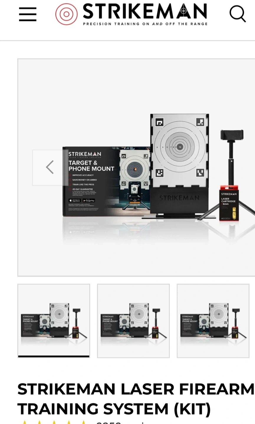 134This is a Strikeman training system for practicing shooting accuracy at home. It's a dry-fire system that uses a laser bullet and smartphone app to track your shots. It's safe, quiet, and non-damaging, so you can improve your accuracy without ammo or range fees. Great for improving accuracy and draw time