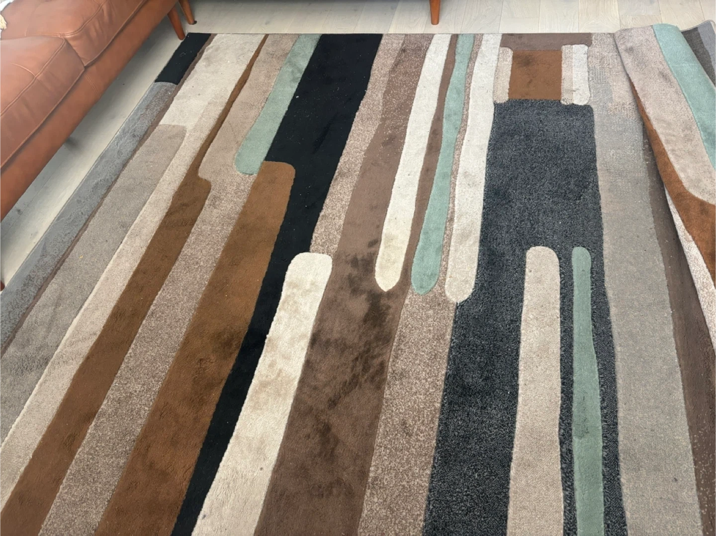 This is a 10x8 area rug with a striped design in earth tones. The rug is in excellent condition and would complement various interior styles. Its durable construction and attractive color palette make it a versatile addition to any space.
