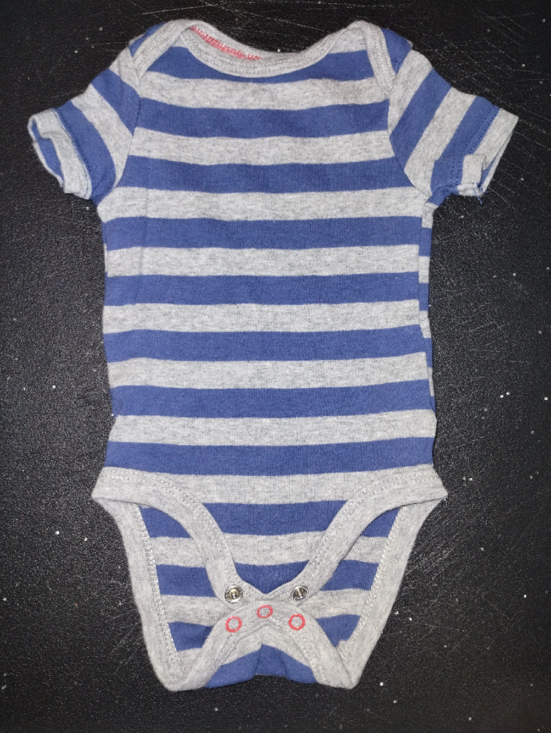 This is a cute striped baby onesie in blue and gray. It's in great condition and perfect for your little one!